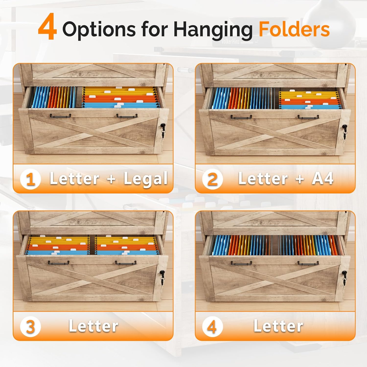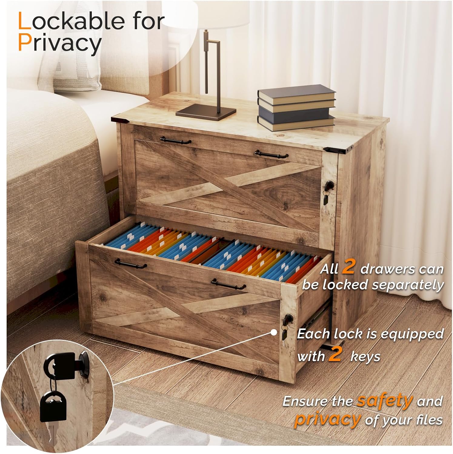 - ăLockable for PrivacyăThe 2 large drawers for hanging folders can be independently locked, and each lock is accompanied by 2 keys for added security.