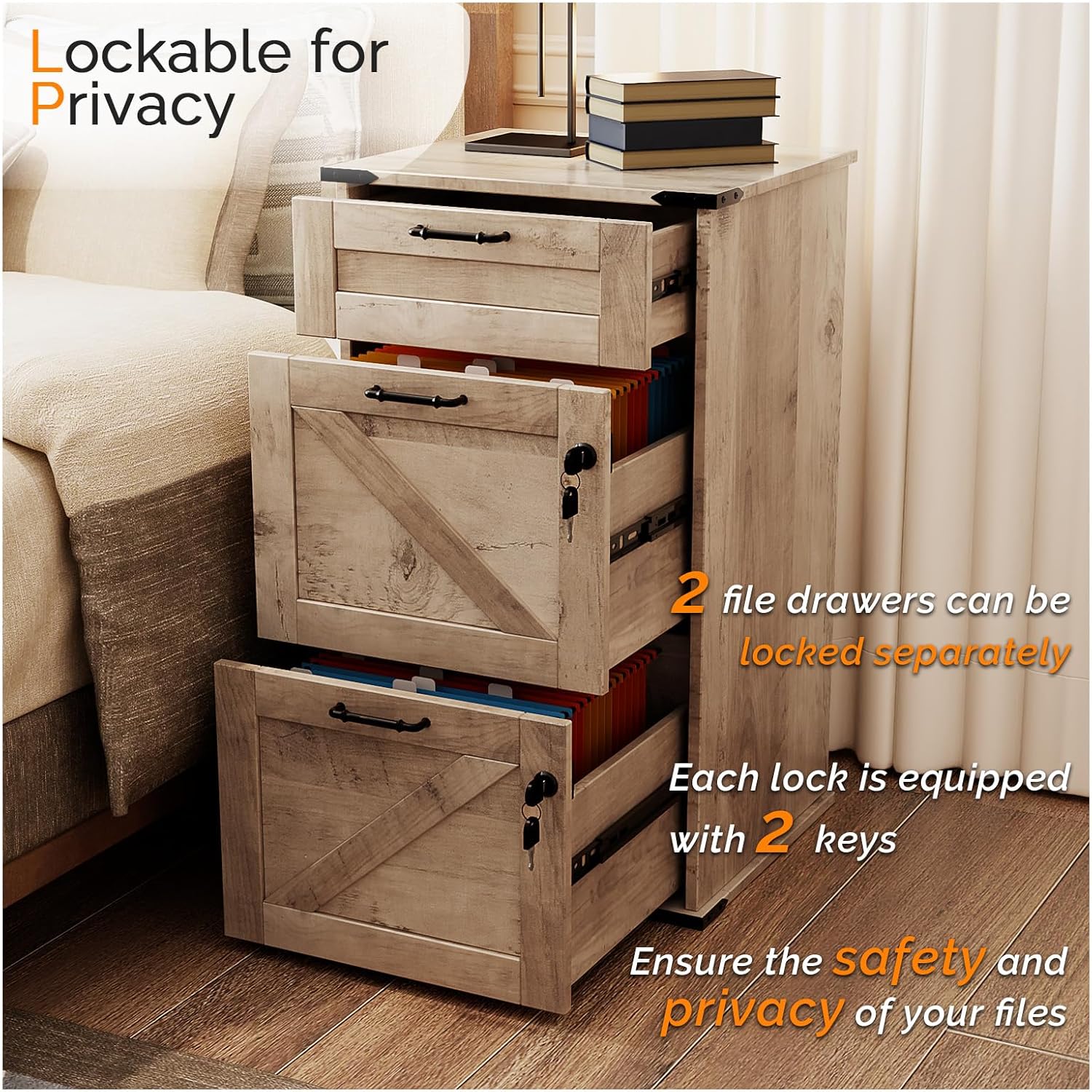 - ăLockable for PrivacyăThe 2 large drawers for hanging folders can be independently locked, and each lock is accompanied by 2 keys for added security.