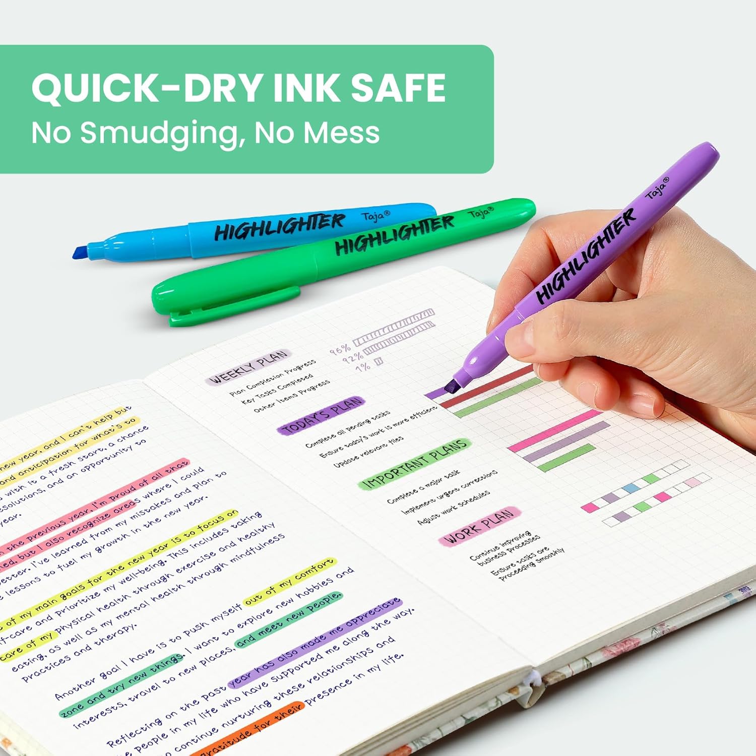 - No Bleed & Smear-Resistant Ink - Designed for clean, confident highlighting. Our quick-drying ink won’t bleed through paper or smudge while you write—keeping your notes neat and your hands stain-free, even when you're in a rush.