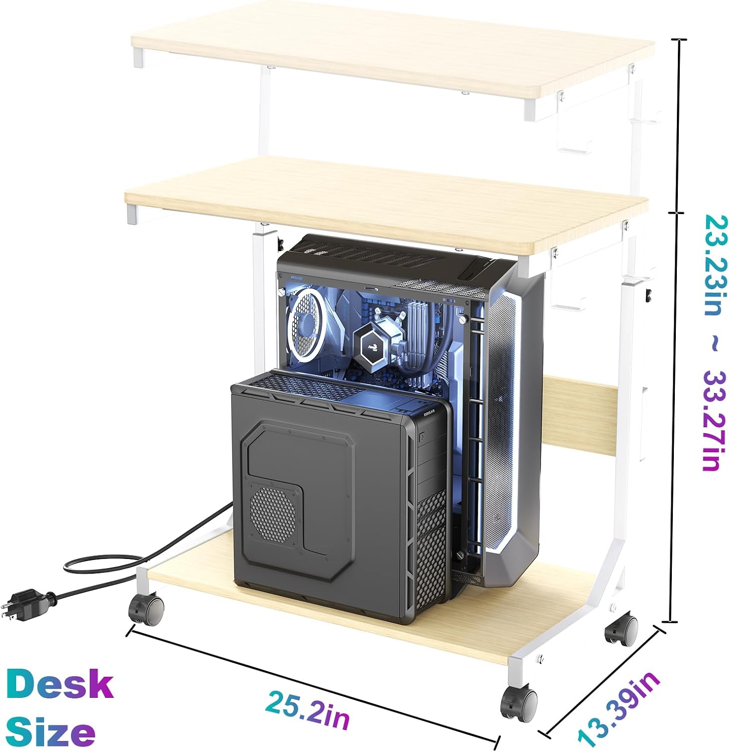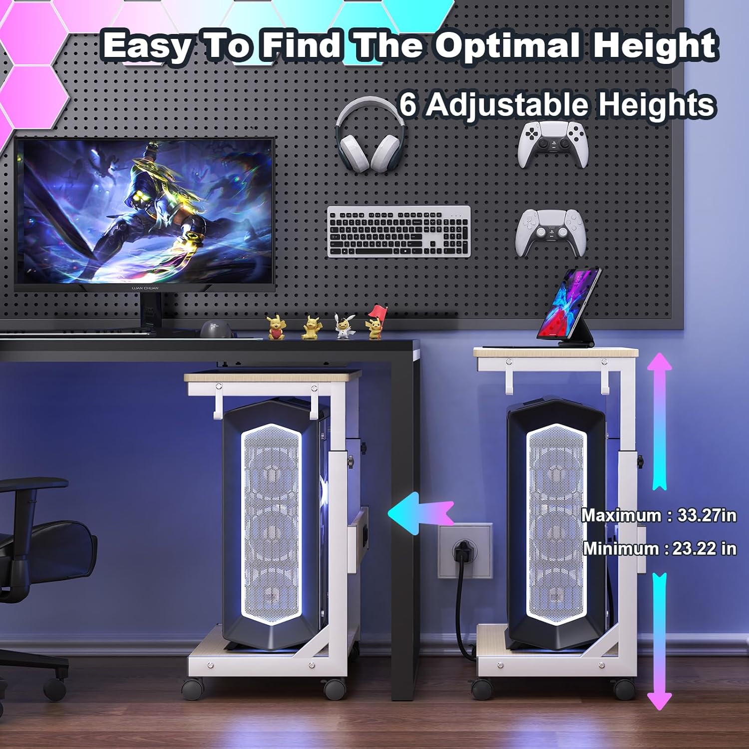 - Height Adjustable Pc Tower Stand: Features unique manual height adjustment ranging from 23.23"-33.27" to speed up heat dissipation and improve overall computer performance, overall dimensions 25.19 inches long, 13.78 inches wide, Allows you to store the tower under or next to a desk, Supports most computer towers on the market including full-tower ATX case