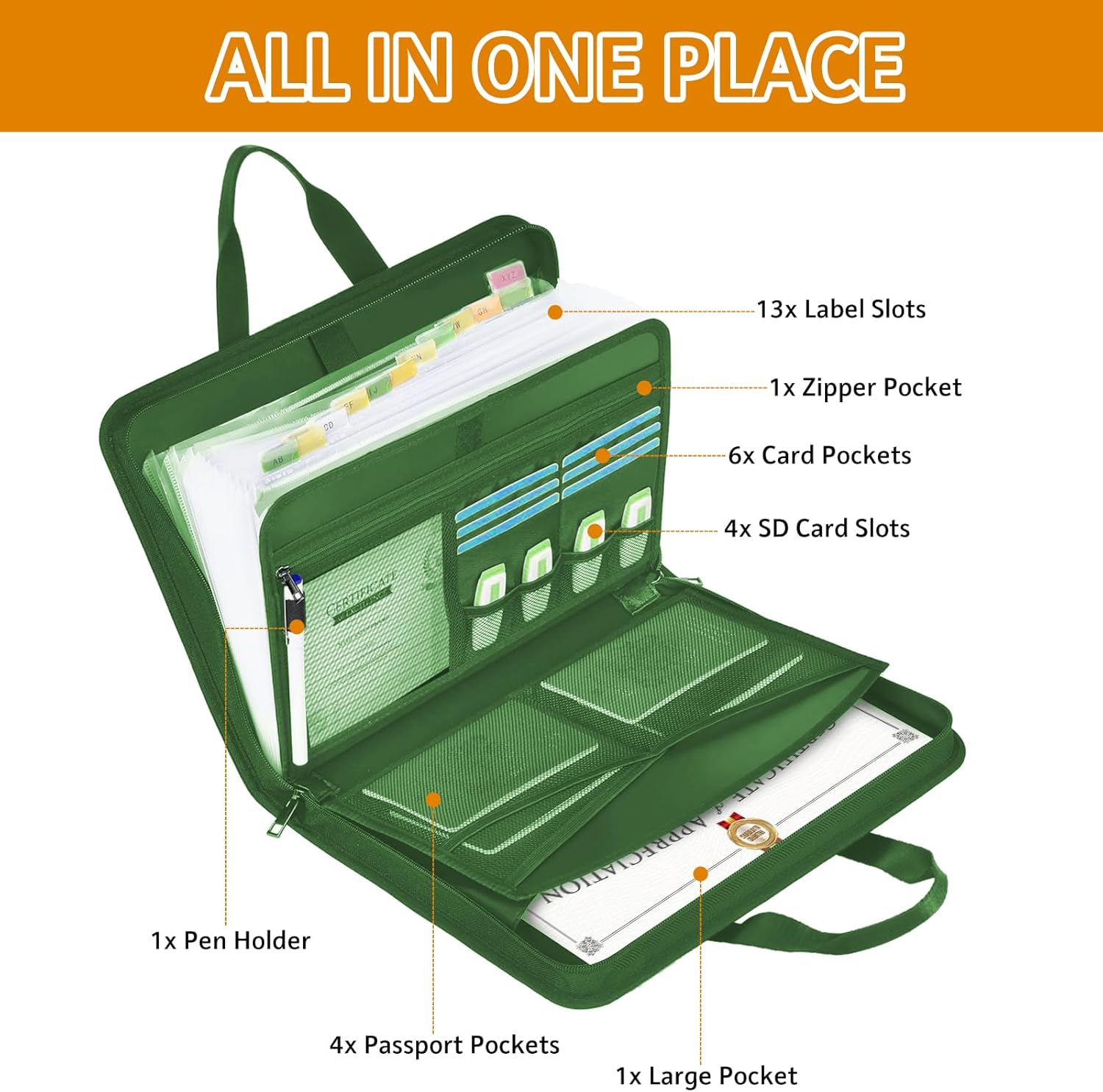 - Enough Space: 14.1 “x11.4 ‘x2’. Our folio document organizer has 1 zippered pockets, 1 pen slots, 4 SD card slots, 13 label pockets(Fit Letter or A4), 6 card pockets, 4 medium mesh pockets and 1 main large pocket