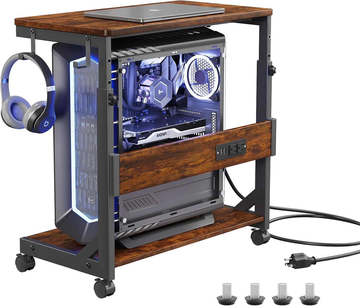 - Pc Tower Stand With Charging Station: This Mobile PC Standing with dual 120V/12A outlets and dual USB ports can power your laptop, smartphone, printer, tablet or any electronic device. Great for keeping an organized workspace. Plus, the PC Tower Rack doubles as a side table to provide additional power for your desk lamp
