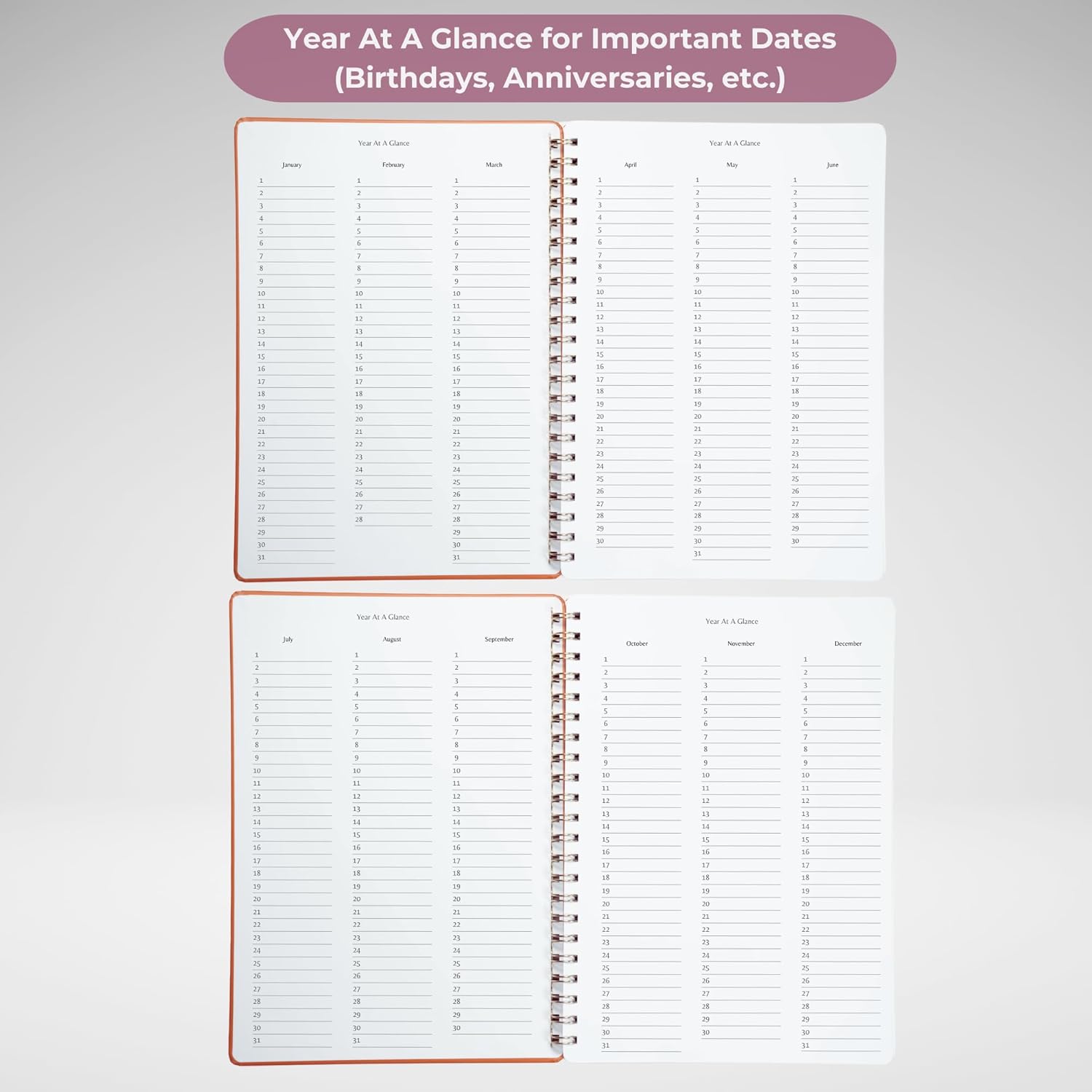 - Year-at-a-Glance Section: Begin your year with a comprehensive overview—perfect for tracking birthdays, anniversaries, and important milestones, all in one place.
