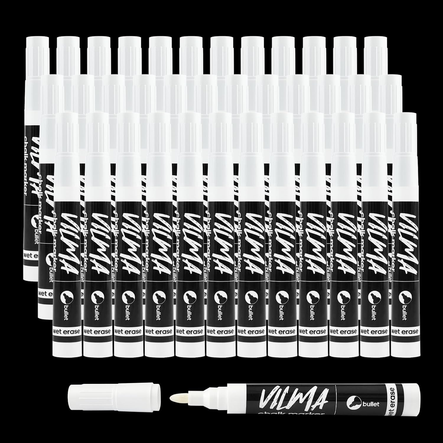 VILMA White Liquid Chalk Markers 36 Pack Chalk Pens for Blackboard, Chalkboard, Windows, Glass, LED Board, Bistro Signs – Erasable Water-Based Ink Ideal for Teachers, Artists & DIY Projects