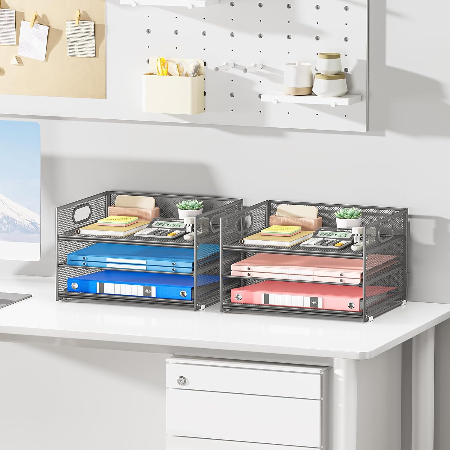 - Paper Organizer Function and Usage: The mesh desktop file organizer can hold various items including paper, folders, books, bills, notebooks, etc. The open design enables quick identification and access to contents, helping to declutter and organize the desk