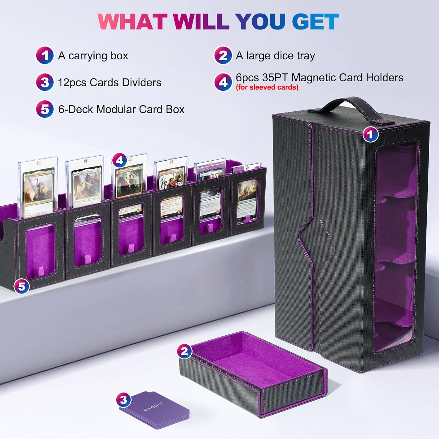 Commander Deck Box for MTG, 6-Deck Modular Card Case with Dice Tray Holds 600+ Double-sleeved Cards, Removable Trading Cards Storage Box with 35PT Magnetic Card Holders for TCG, Black Purple