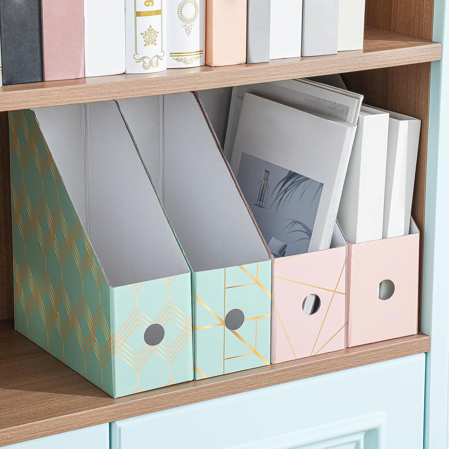 PerKoop 6 Pcs Magazine File Holder Foldable Decorative Cardboard File Folders 6 Patterns Floral Colored Magazine Rack with Printable Sticker Labels for School Office Home Desk (Geometric Lines)