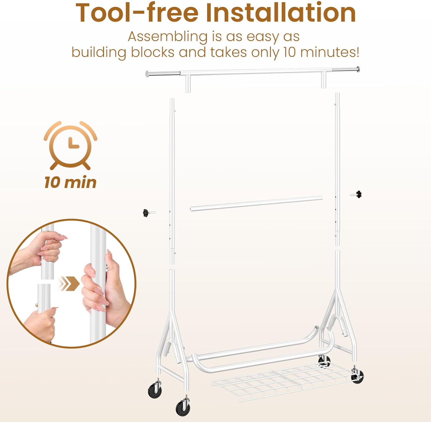 - ๐๐ผ๐๐ ๐๐ ๐ผ๐๐๐๐๐ฝ๐๐: The hanging clothes rack has been carefully designed with simple components, no need to worry about missing parts and tools. Secondary installation or disassembly can be done in 1 minute without tools, perfect for yard sales, seasonal storage, making assembling metal clothes rack easy and simple, saving you a lot of time. You can assemble our rolling racks with the help of the instructions or refer to our installation video.