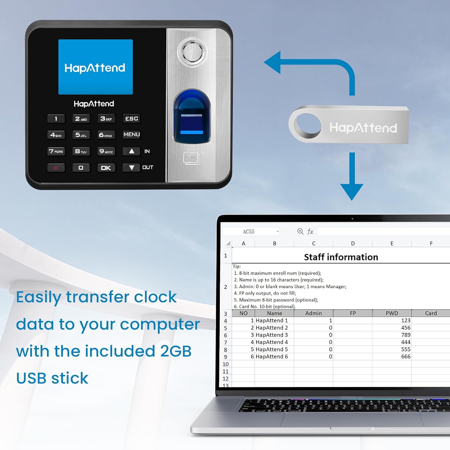 - Standalone Use: In order to protect data privacy, HapAttend time clock prohibits internet connection, and data can be transmitted through USB flash drive.