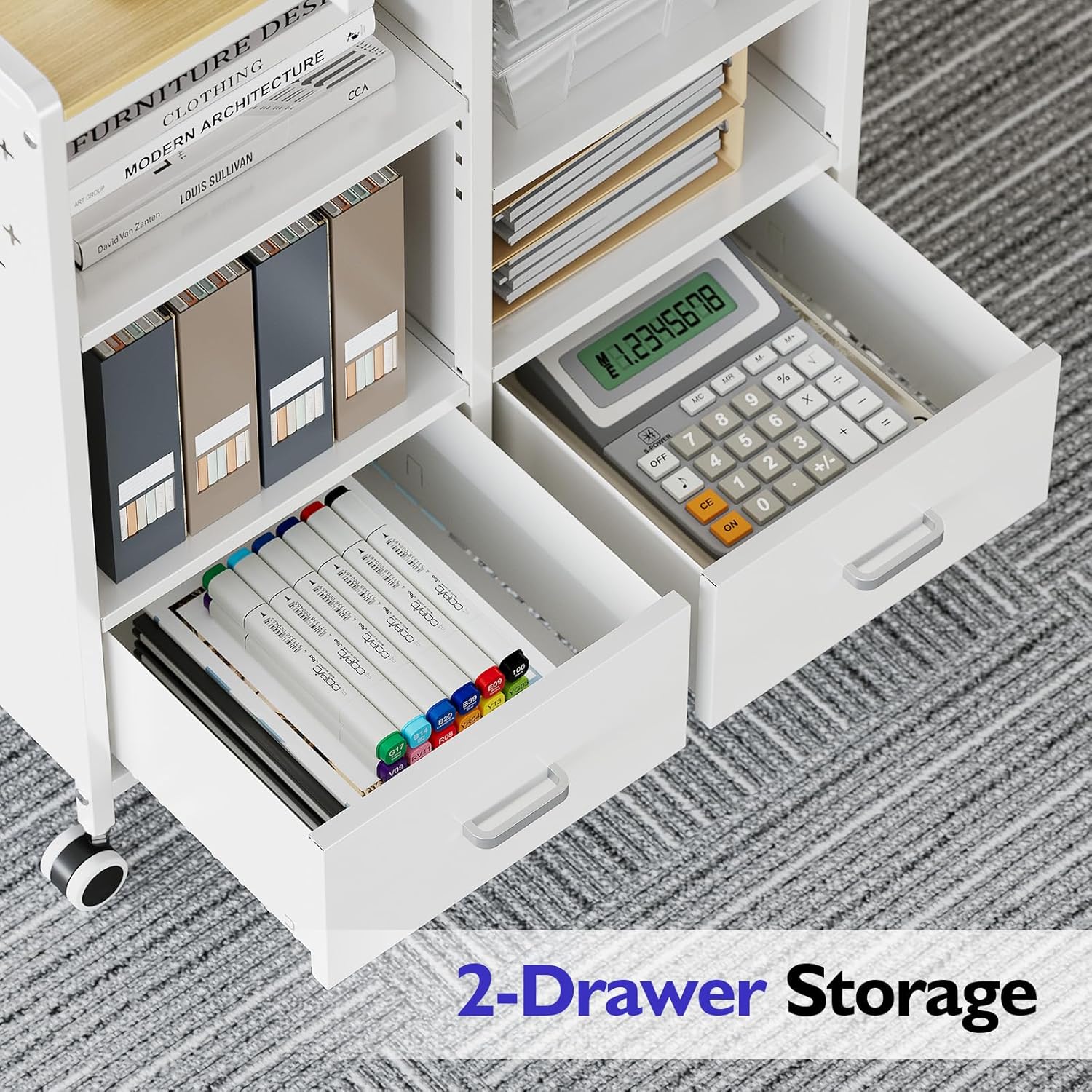 - Smart Adjustable Storage with Organizers:Organize efficiently with 2 spacious drawers (12.91"D x 10.08"W x 4.92"H) Letter files, plus 2 height-adjustable open shelves. The pegboard side includes 2 storage bins and 4 handy hooks - perfect for keeping pens, scissors and office supplies within reach.