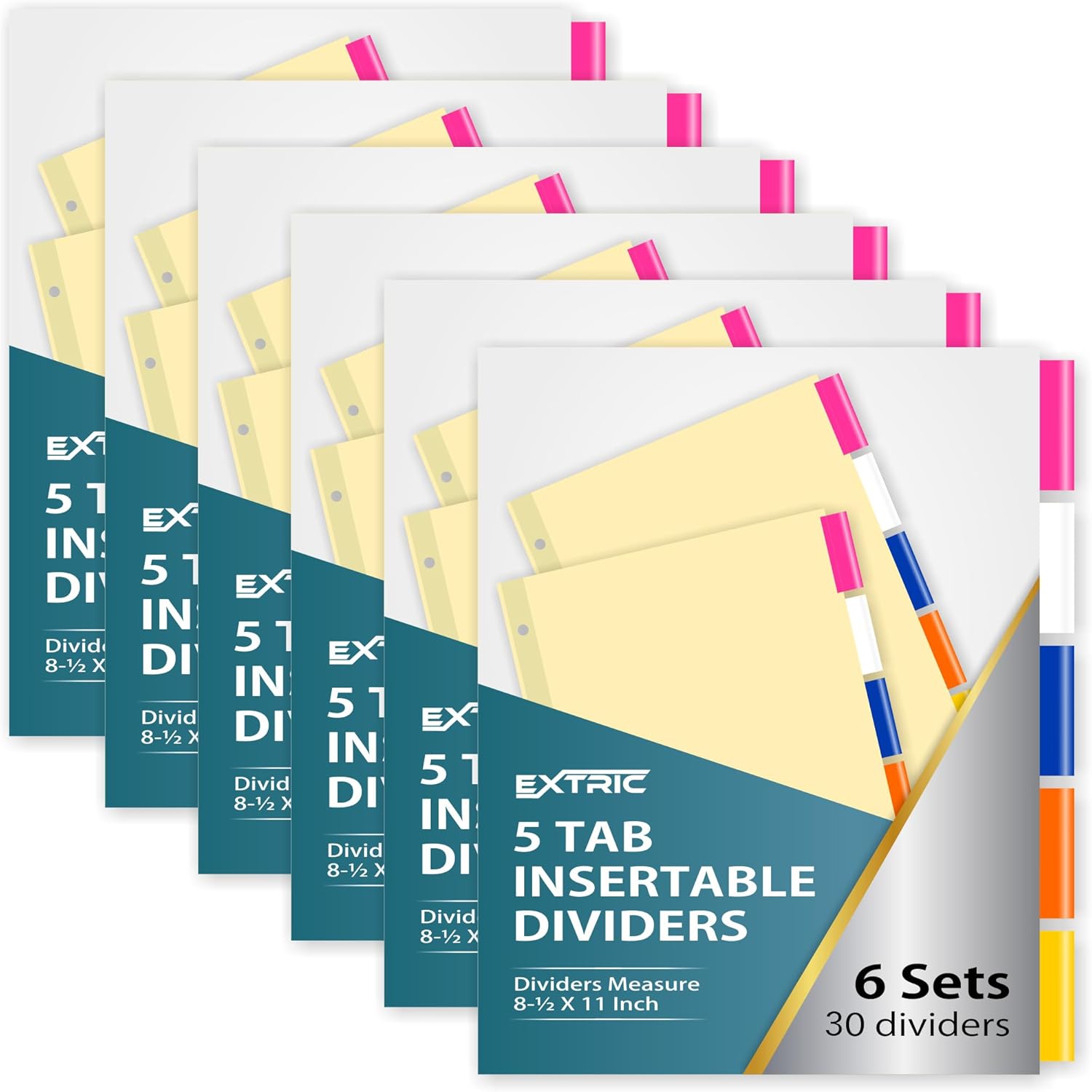 - Includes 6 sets of 5 tab binder dividers. Total of 30 3 ring binder dividers with tabs to keep your binders neatly organized and presentable. Includes 10 white paper inserts per set for your dividers.