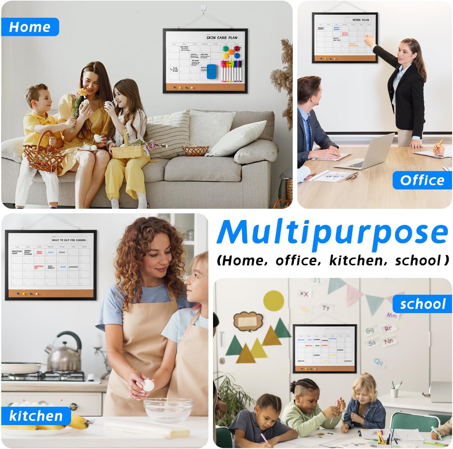 - ✔️ 【2-in-1 Multi-Function Design】This product combines a magnetic whiteboard, calendar, and cork bulletin board into a space-saving 17" x 13" frame. Easily record schedules, work plans, study tasks, meal plans, and more.