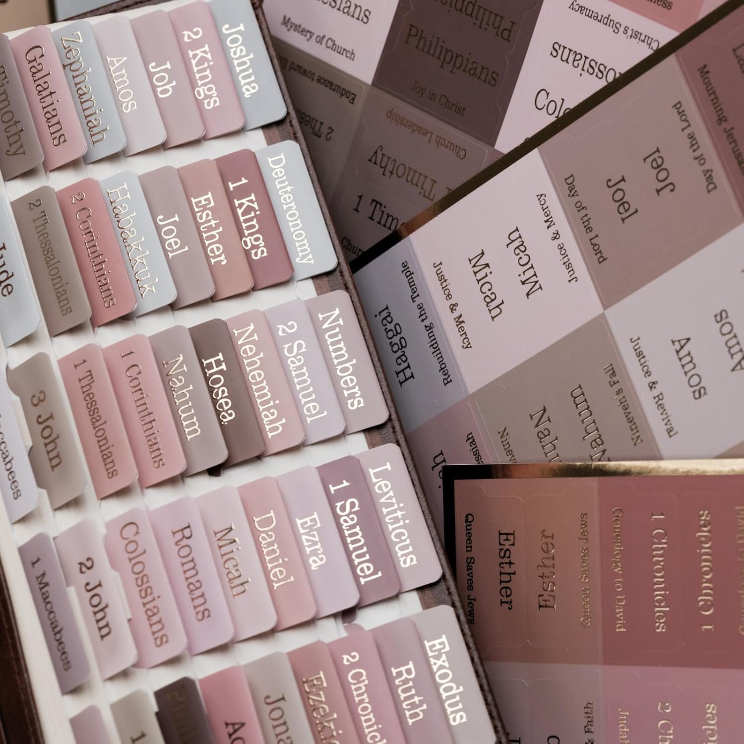 - Large Print, Easy to Read & Easy to Install:Silky velvet touch laminate,carefully designed pretty Bible accessories . The peel-and-stick Bible index tabs are self adhesive, simply align them with the provided guide or place them creatively.