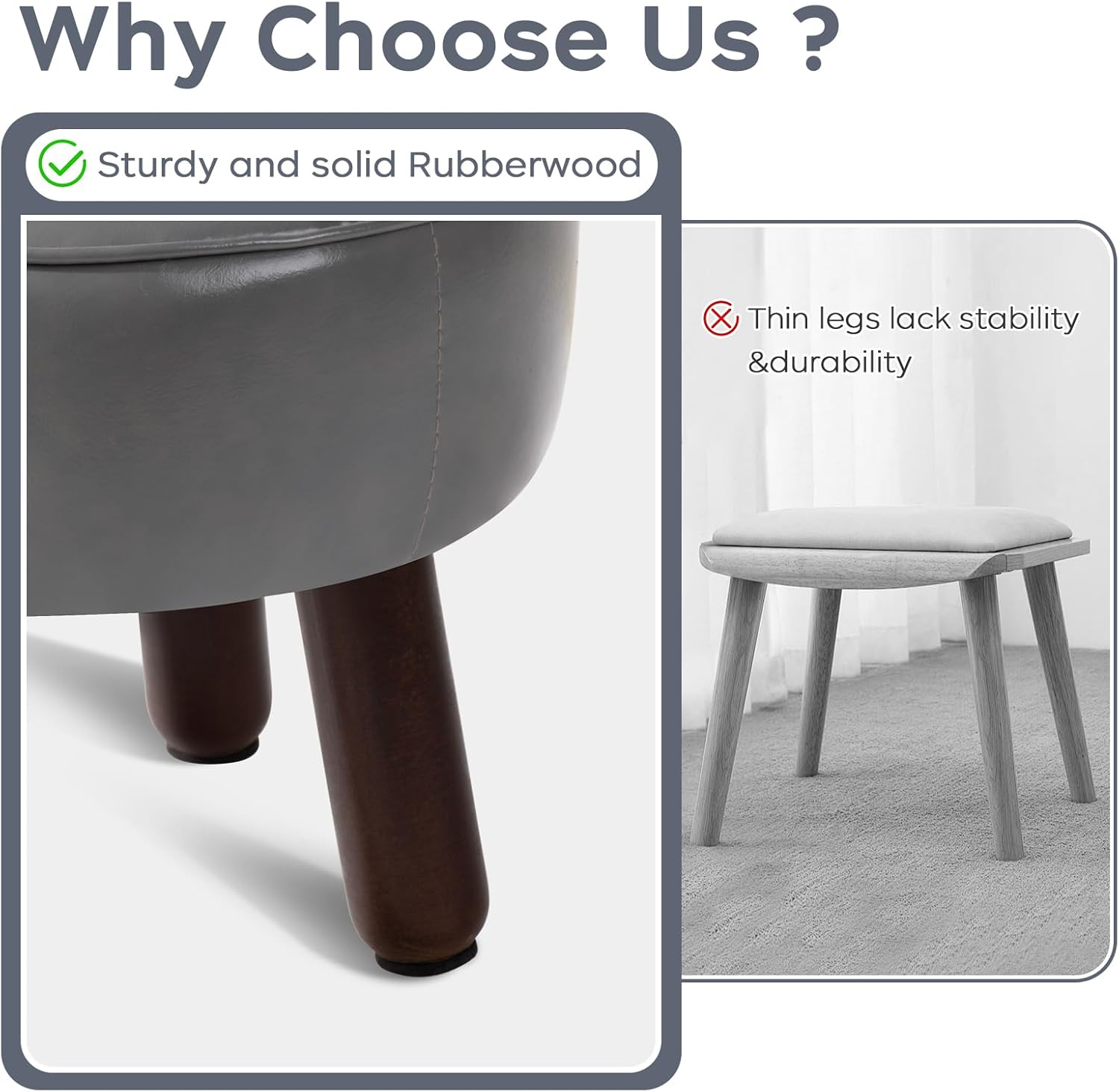 - ăAnti-Slip Designă- These leather foot stools small ottoman rubber legs come with dedicated felt pads to prevent scratches on floor and keep it from sliding.Wood leg with non-slip felt pad is quiet when moving, and can avoid leaving scratches on floor.The small footstool is perfect for small spaces and is compact enough not to get in anyone's way.