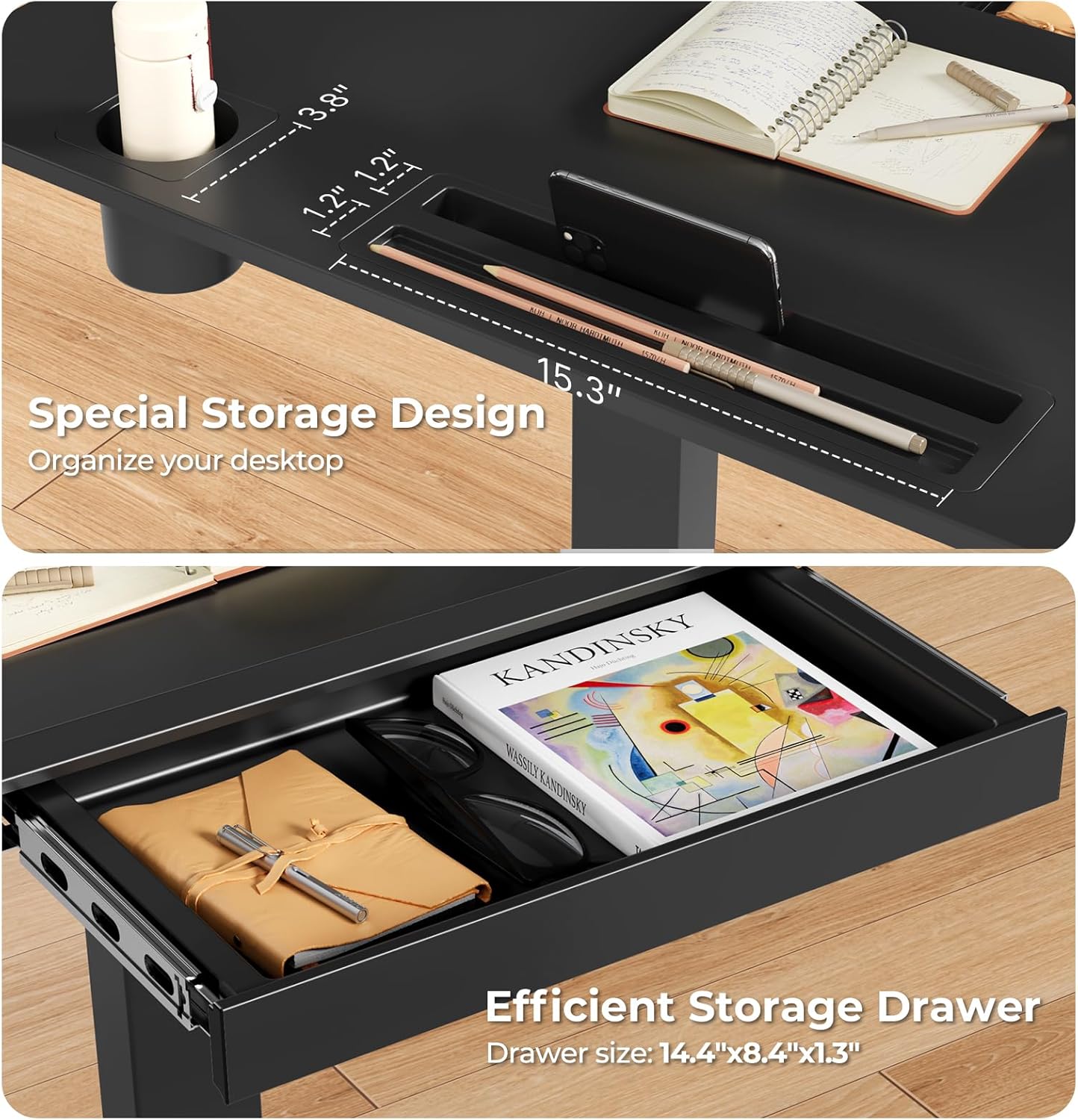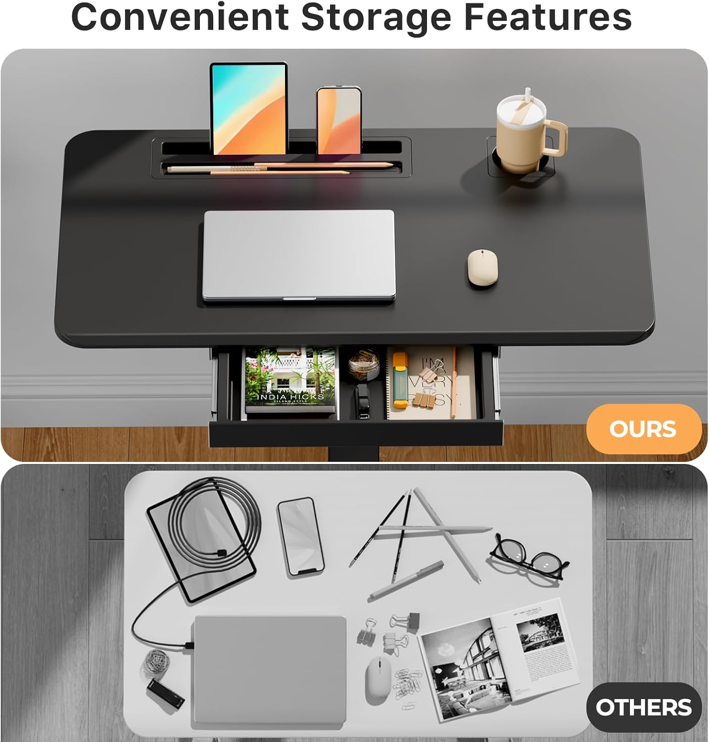 - Convenient Storage Drawer: Small standing desk features a drawer (Size: 14.4"Ă—8.4"Ă—1.3") that offers generous storage for office supplies, helping maintain a clean workspace. Additionally, 2 hooks design facilitates organization of headset or backpack