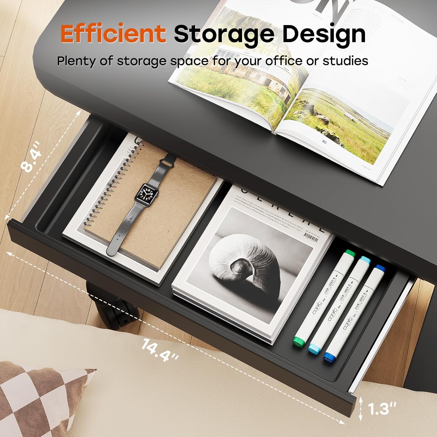 - Small Mobile Laptop Desk: The desktop measures 23.6"Ă—19.7", making it ideal for any compact workspace. While equipped with cup holder and dedicated slots, it's a good way to contain your drink and office supplies