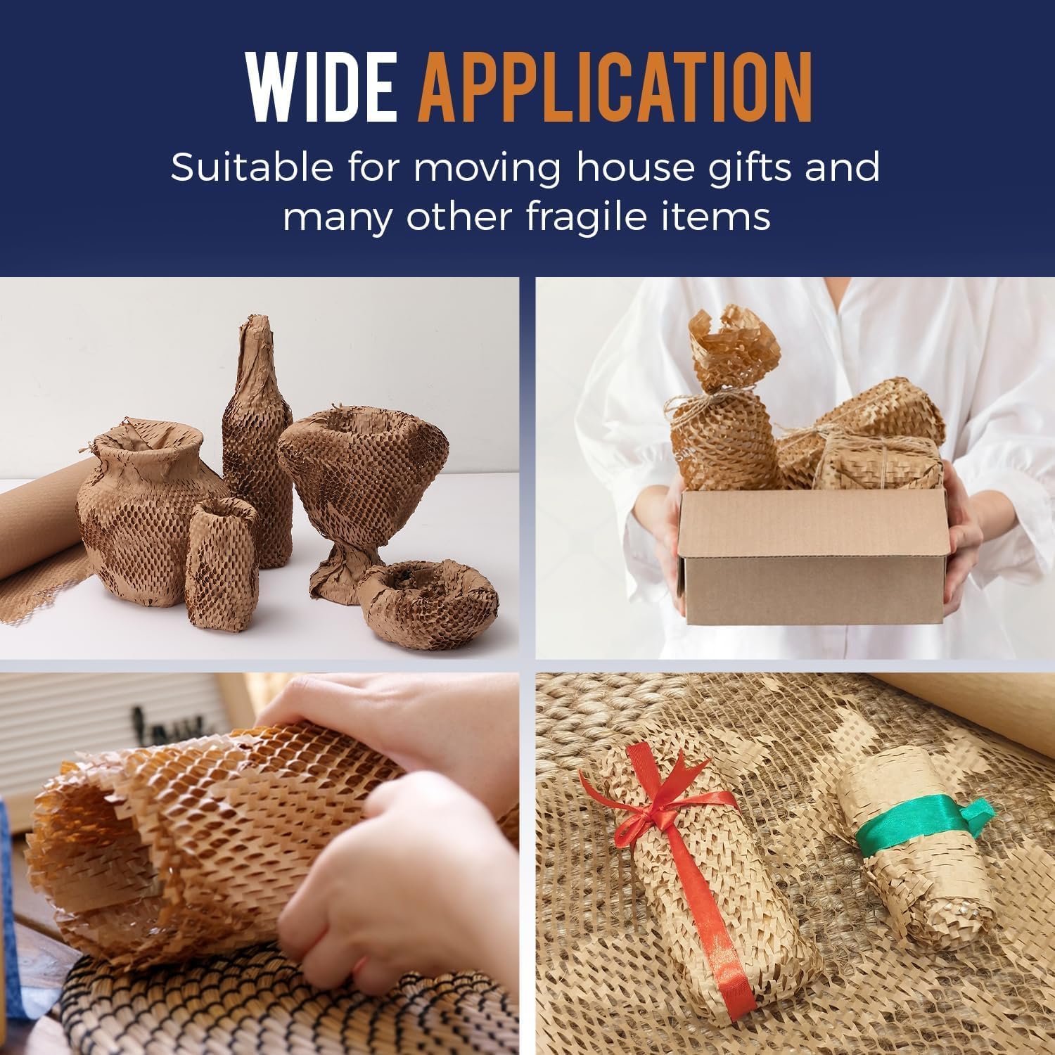 - Certified FSC C204227 Eco Friendly Shipping Supplies: Say goodbye to large bubble wrap roll! Our honeycomb wrapping paper for moving essentials offers an eco-conscious alternative. Crafted from 100% recyclable packing materials. This gentle packing paper sheets for moving keeps your items safe in transit