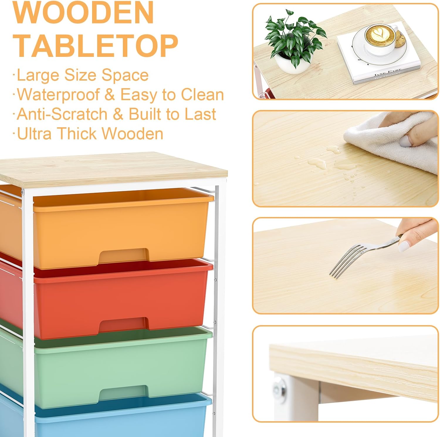 Utility-Rolling-Storage-Drawer-Craft-Cart-Organizer with 4 Drawers and Wooden Tabletop & Lockable Wheels for Home Office, Bedroom, Kids Room, Classroom, 4 Tiers Under Desk Drawer Cart, Macaron