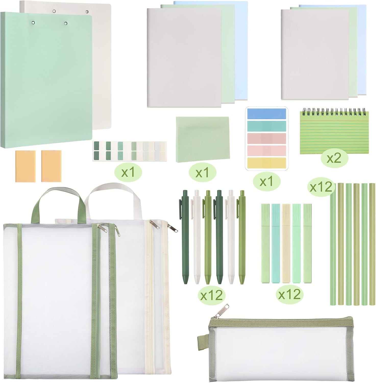 Colarr 54 Pieces Aesthetic School Supplies Including Pastel Highlighters Document Bags Pencils Notebooks Pencil Pouch Ink Pens Sticky Notes Erasers Back to School Gift Stationary Kit(Green)