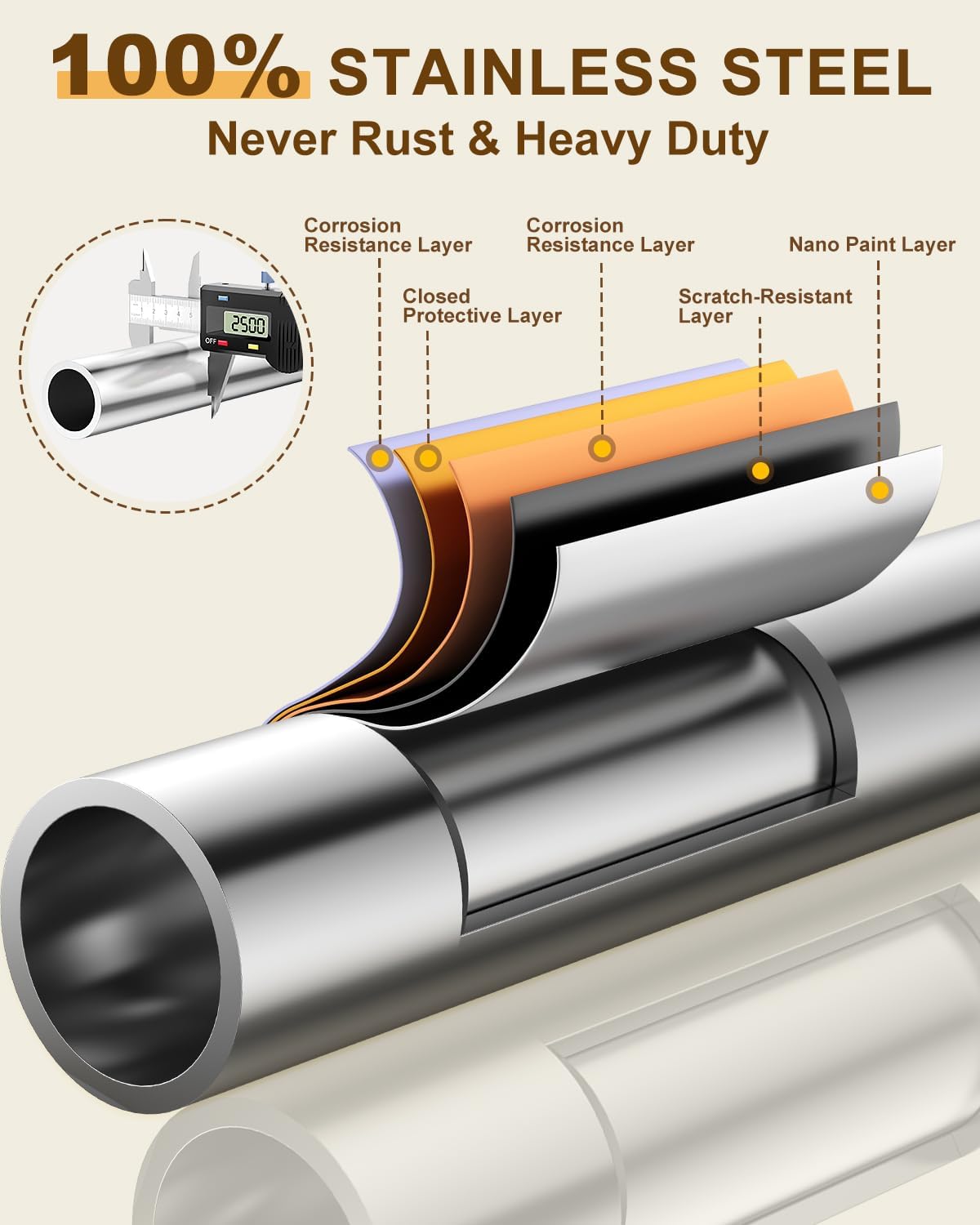 - 100% STAINLESS STEEL STRENGTH - ENJOY 760 LBS & RUST-DEFYING! Boasting an industry-leading 760 lbs weight capacity, 50% stronger than competitors, our NEWEST clothes rack confidently handles your heaviest garments. It features 100% stainless steel design, with even the smallest screws made of the same high-quality material. We've implemented a cutting-edge five-layer coating process, including an extra protective sealant layer, ensuring your rack remains rust-free and resistant to wear and tear.