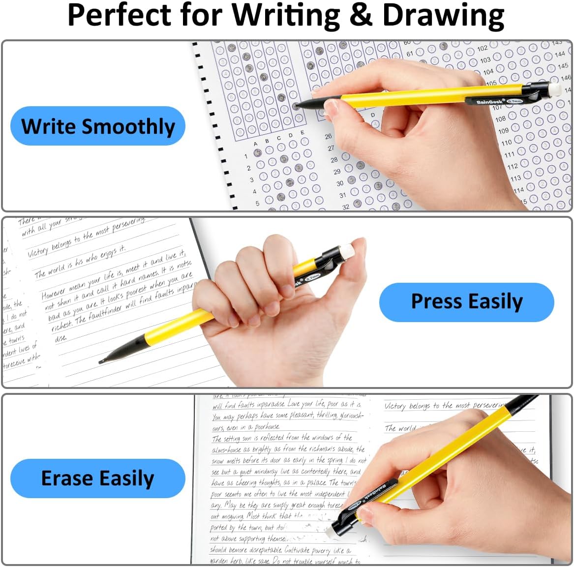 - Ene Eraser with Mechanical Pencil - Each lead pencil comes with an end eraser on the click button, you can erase pencil marks easily and cleanly, and it’s durable enough for normal use.