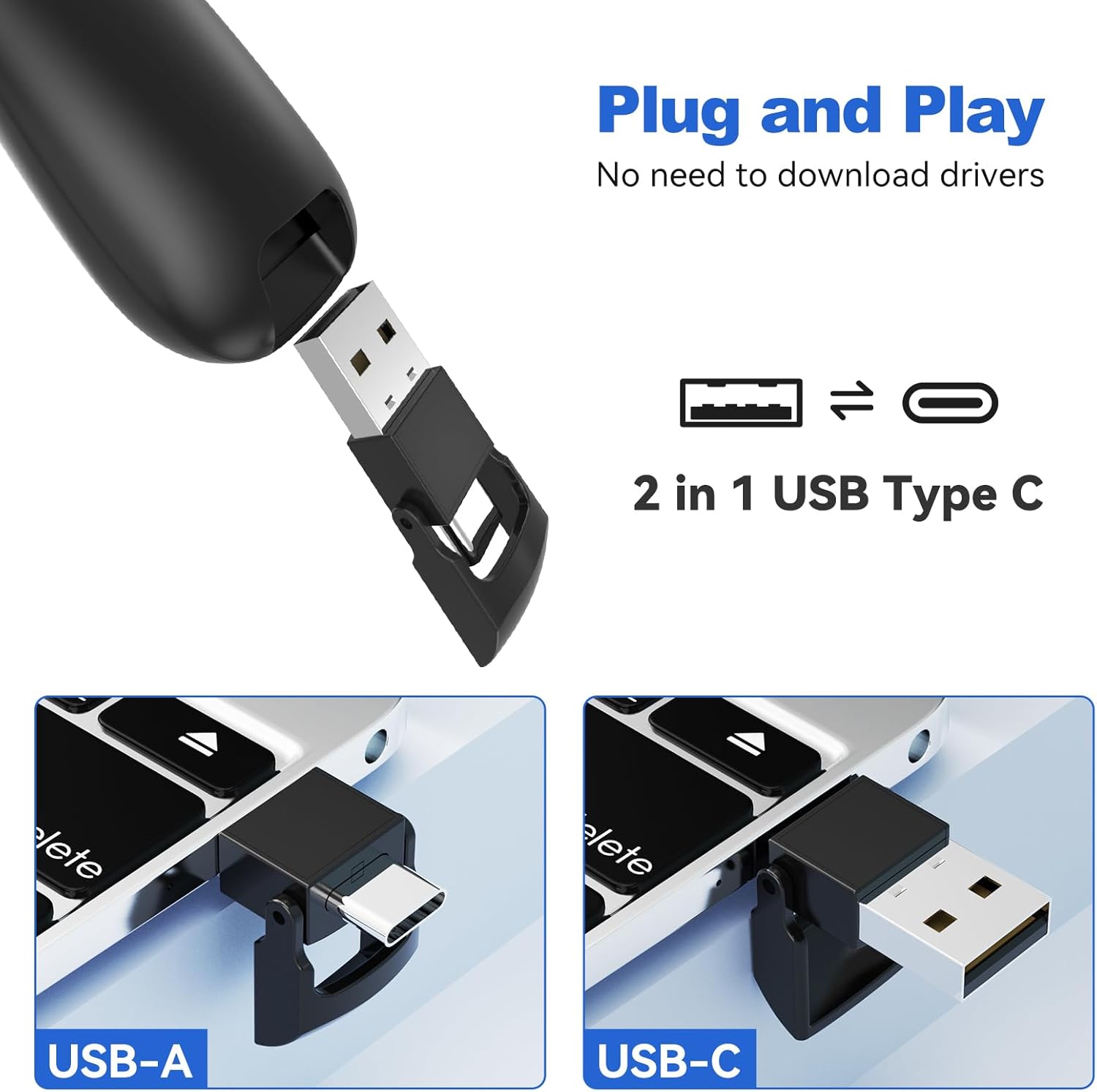 - [USB A & USB C 2 in 1 Receiver, Plug and Play] No installation needed, no assembly or hard instructions to follow. Just plug and play. You simply plug the USB receiver into your computer and start using the laser pointer for presentations. Slide clicker receiver is not only fit for devices with USB A interface, but also for devices with Type-C interface.