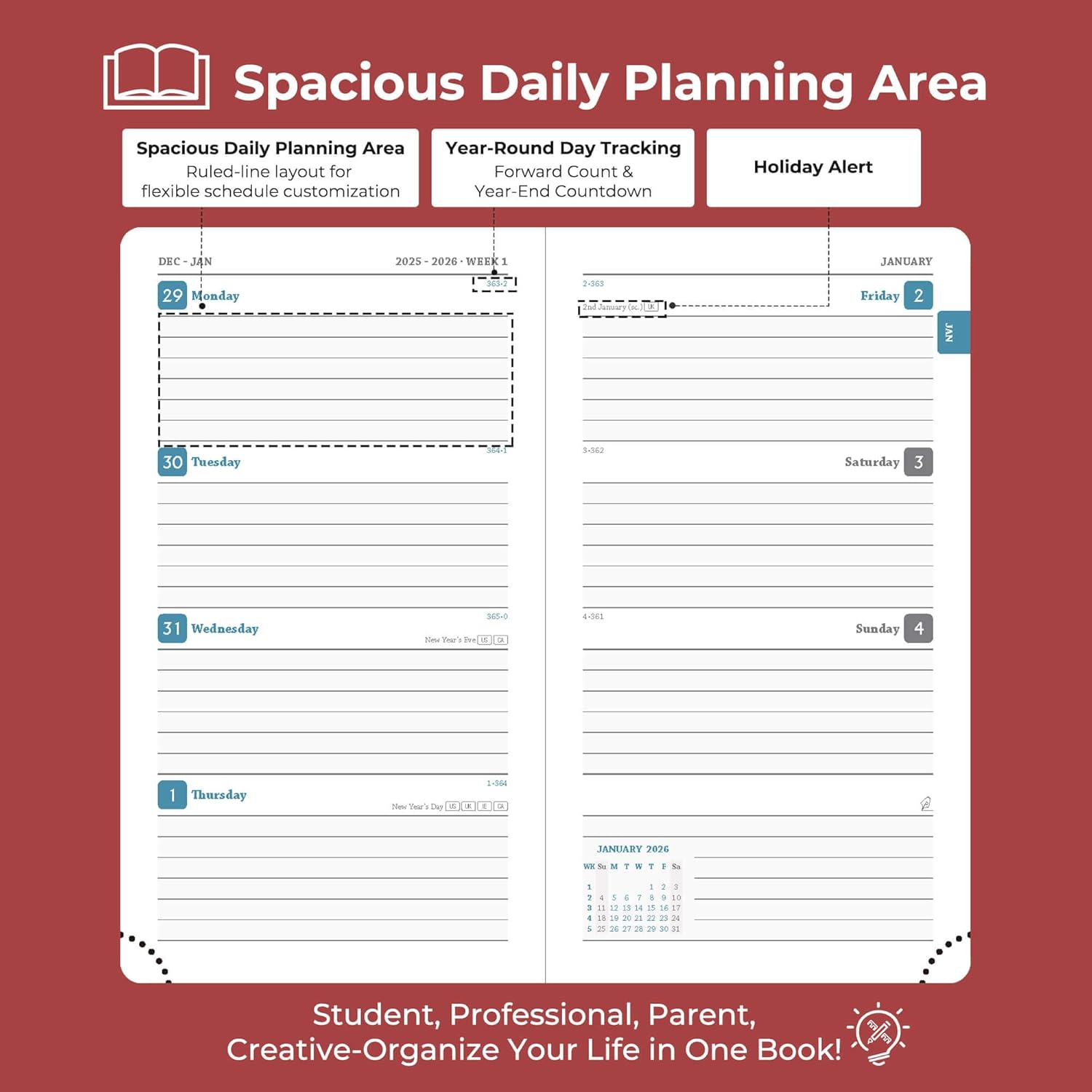 - Professional Grade Material for Your Daily Planner: Crafted with FSC 100GSM thick paper, this 2026 planner ensures good writing with markers while gentle on your eyes through its ivory white pages. The leather soft cover and lay flat binding make it a calendar planner companion for busy professionals, students, and families
