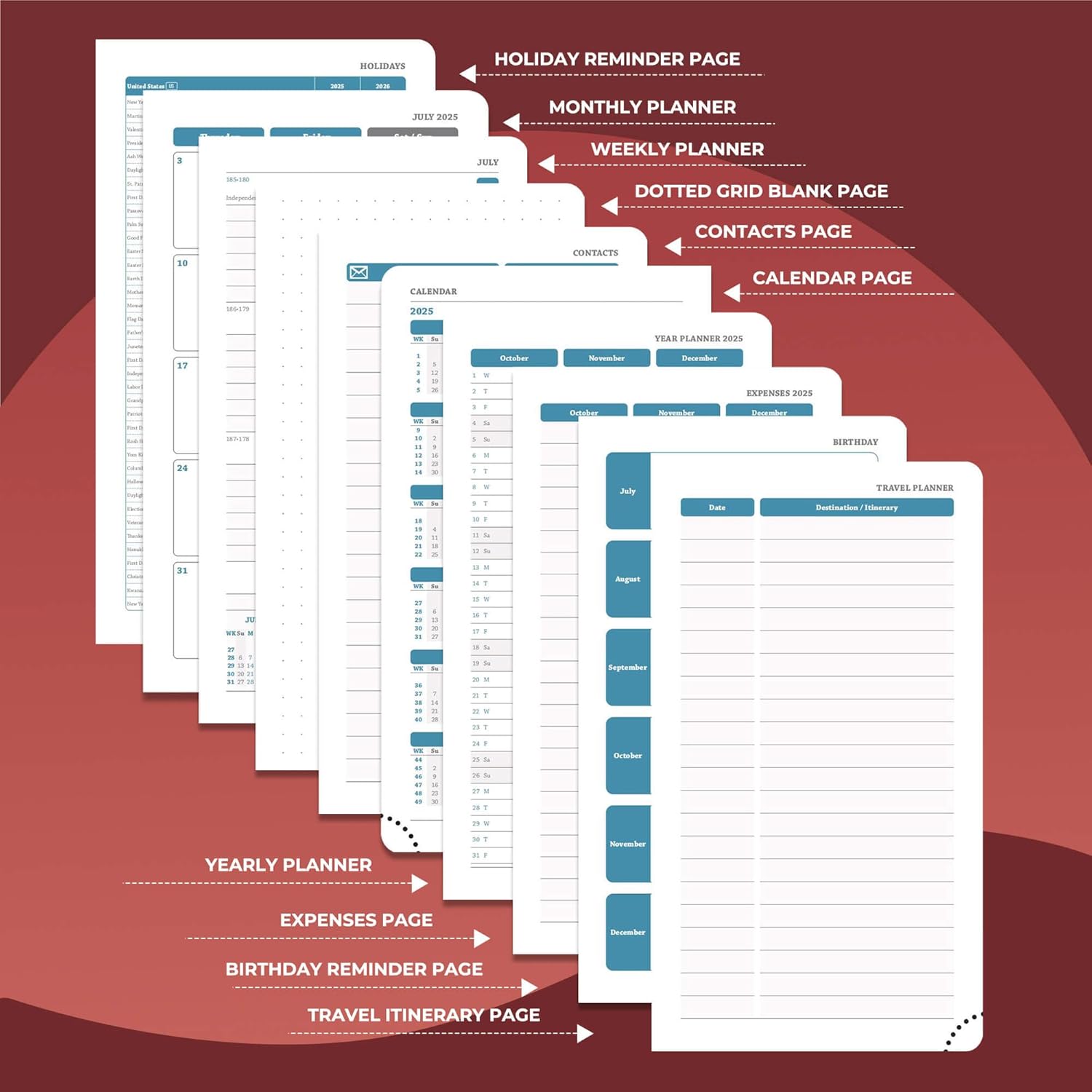 - Multi function Page: Personalized planner system. Year plan pages, holiday reminders, birthday record area for relatives and friends; set up storage contacts, and record inspiration and plans with the dot matrix note area; at the same time, work planner can travel planning and expense management modules to achieve coordination of schedule and finance