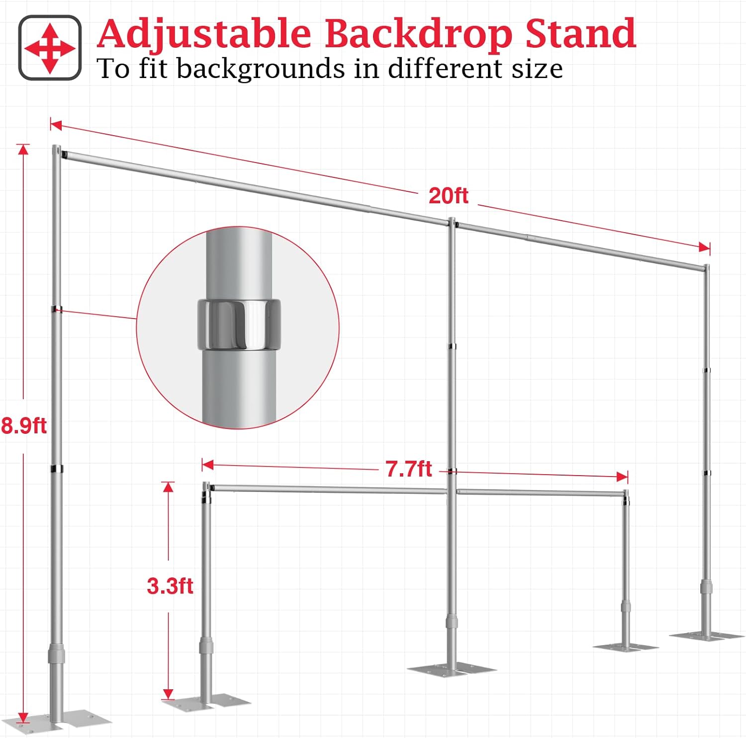 - 【Sturdy Photo Background Stand】8.9x20 ft /2.7x6 m heavy duty backdrop stand. Aluminum and steel framework provides maximum stability and professional durability,Sturdy base legs provide sturdy balanced support for safety and reliability