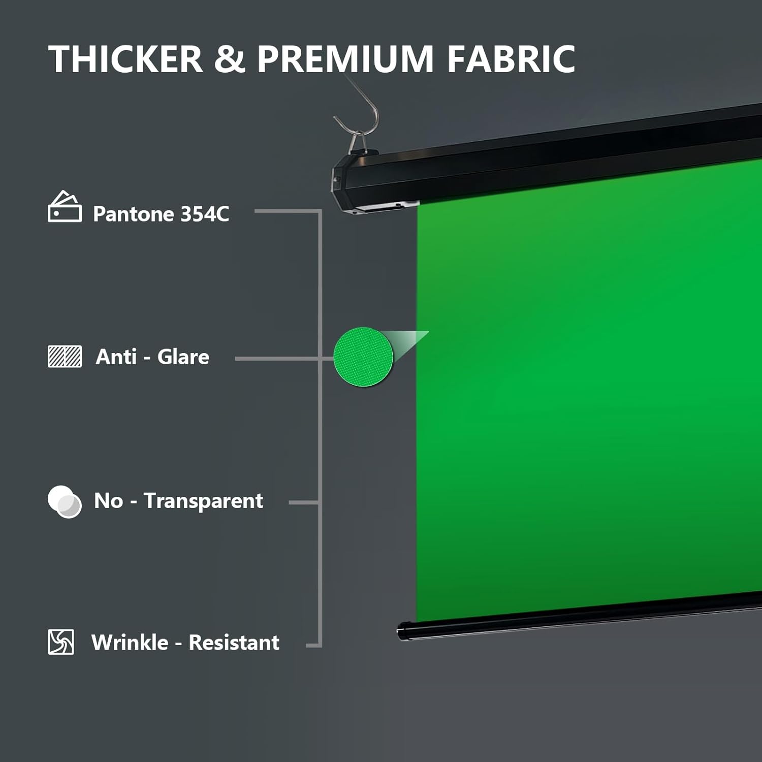 - đăScreen SizeăOur motorized drop-down green screen measures 59.8"(W) ââx 86.6"(H), providing professional color for capturing content.