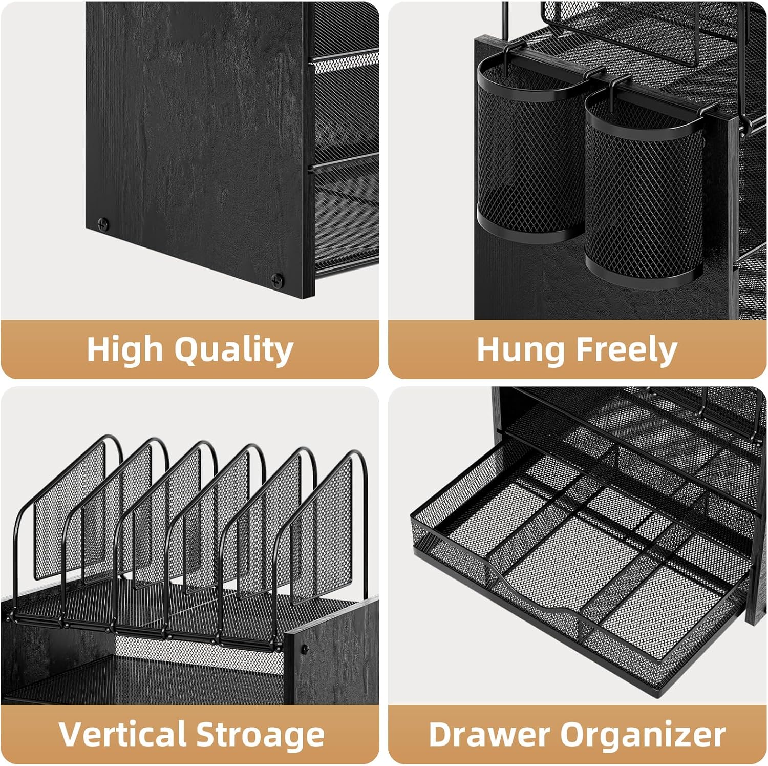 Marbrasse Desk organizer with Drawer, 4-Tier Wooden File Organizer with 5 Vertical File Holders and 2 Pen Holders, Desk Organizers and Accessories for Home Office - Black