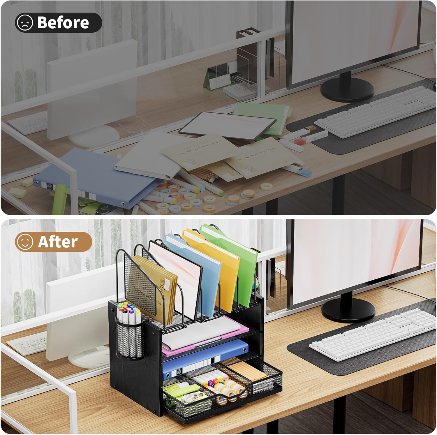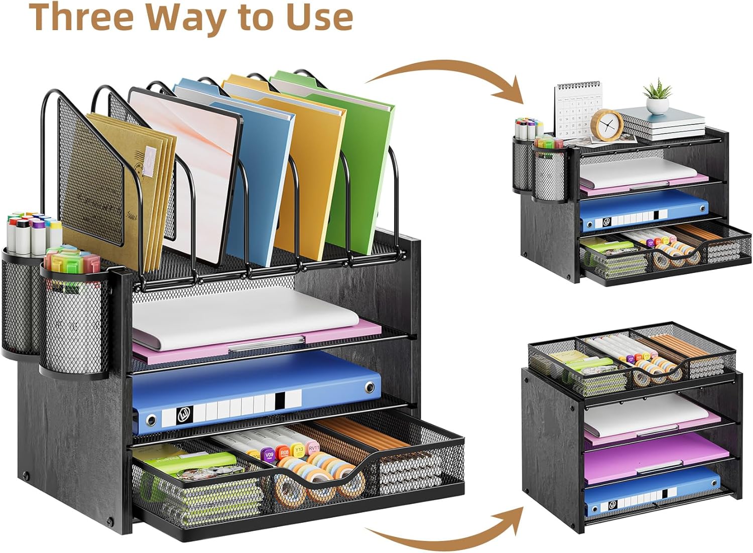 - ăMultifunctional Desk organizerăOur upgrade desktop file organizer has vertical and horizontal storage space â 4 Tiers +5 vertical sorters +3 compartments drawer+ additional 2 pen holders . Upright section has five 2" Compartments for magazines, bill, file, book. Three types of use to meet your various office needsďźďź
