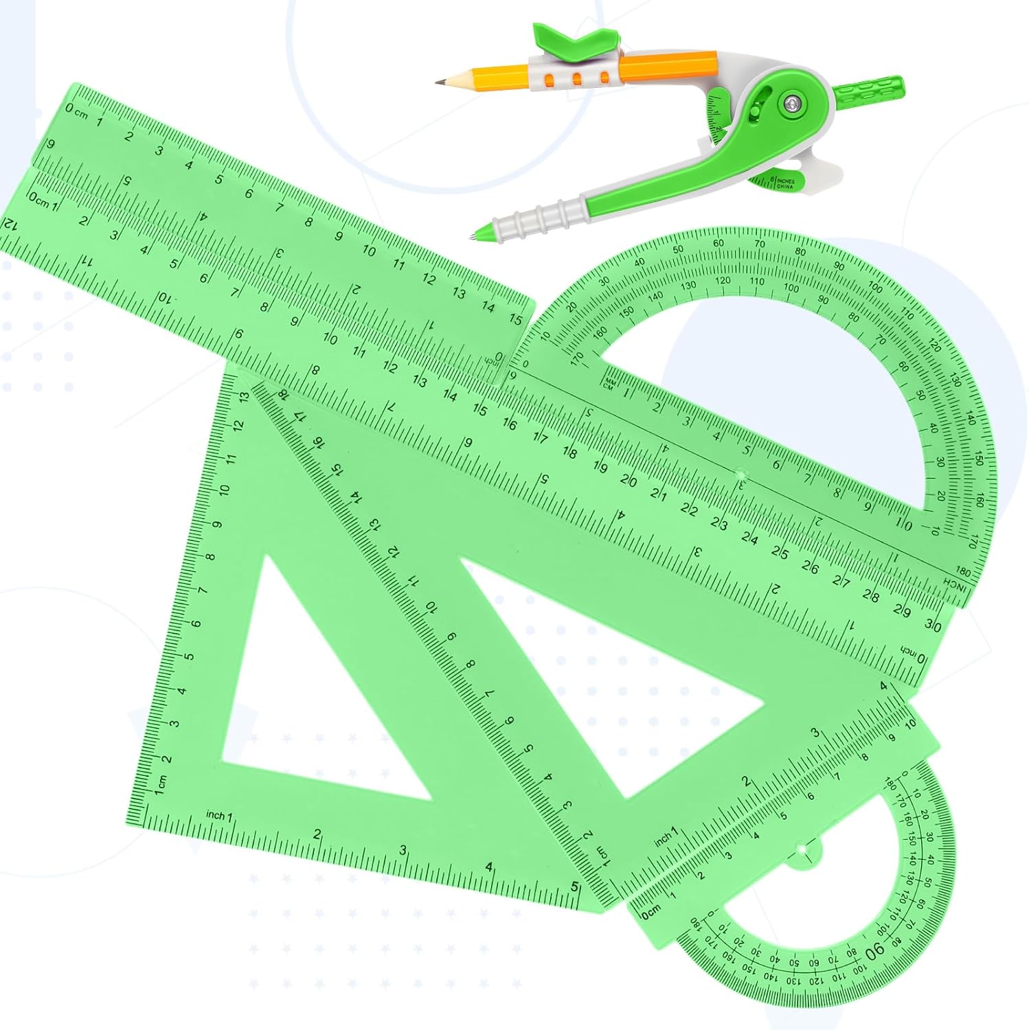 - Geometry Tool Set for Professionals Students: includes 2 pcs plastic ruler (11.81'' / 30 cm, 5.91'' / 15 cm), 2 pcs hollow protractor (6'' / 15.24 cm, 4'' / 10.16 cm), 1 pcs bevel triangle, 1 pcs isosceles triangle and 1 pcs plastic compass with pencil, this comprehensive set meets all drafting, measuring, and drawing needs