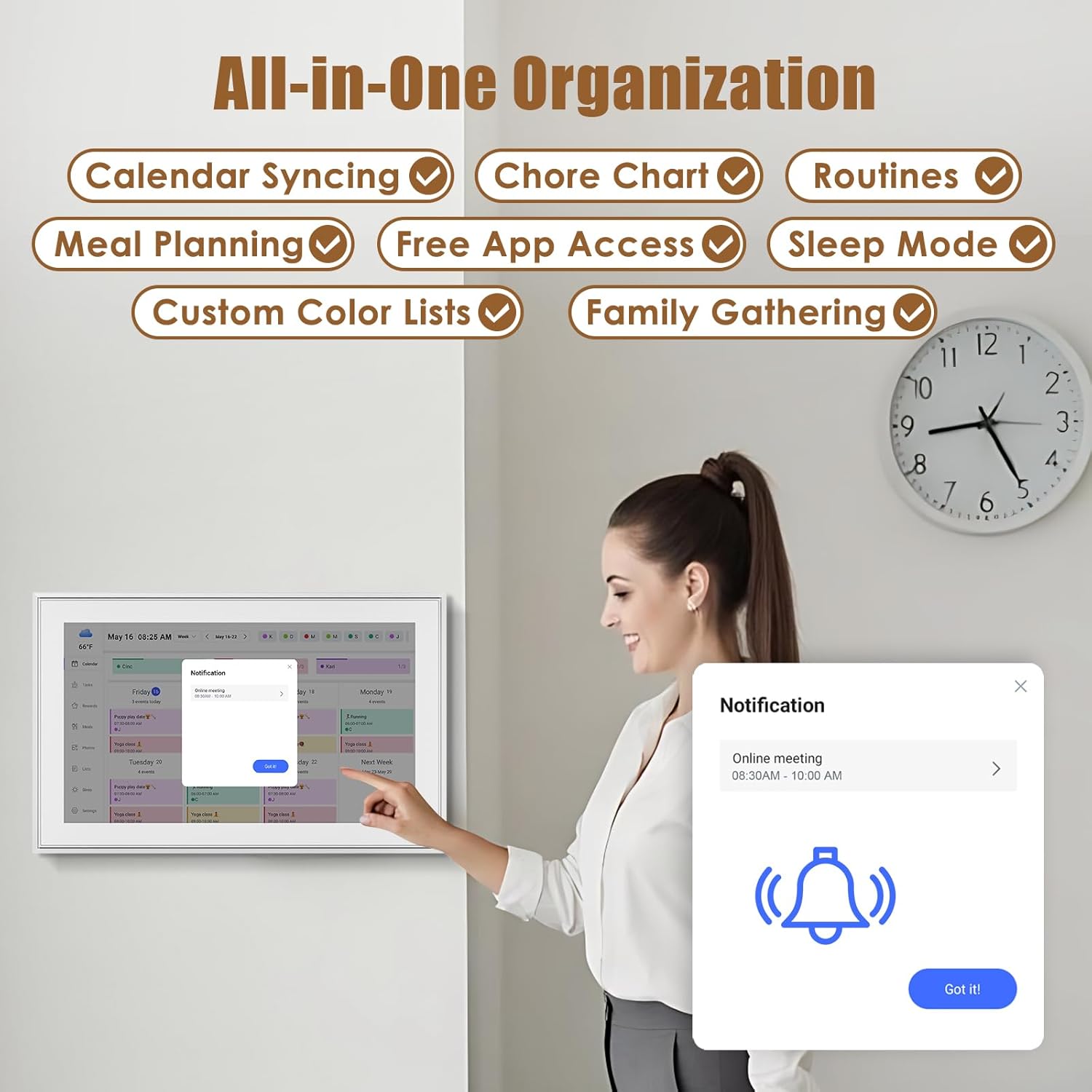 - ✅Perfect Gift for Everyone:Perfect gift for Mother's Day, Father's Day, Valentine's Day, Thanksgiving, Christmas, Wedding, Birthday and so on. It has multi-functions, such as photos/videos, sleep mode, adjustable brightness. Customize your digital wall calendar touch screen with colors and unique tag names.Share your calendar with friends, family, or colleagues and coordinate plans effortlessly. Can view and edit the calendar the same time, Support permission classification, Assign tasks to multiple person and track project progress.