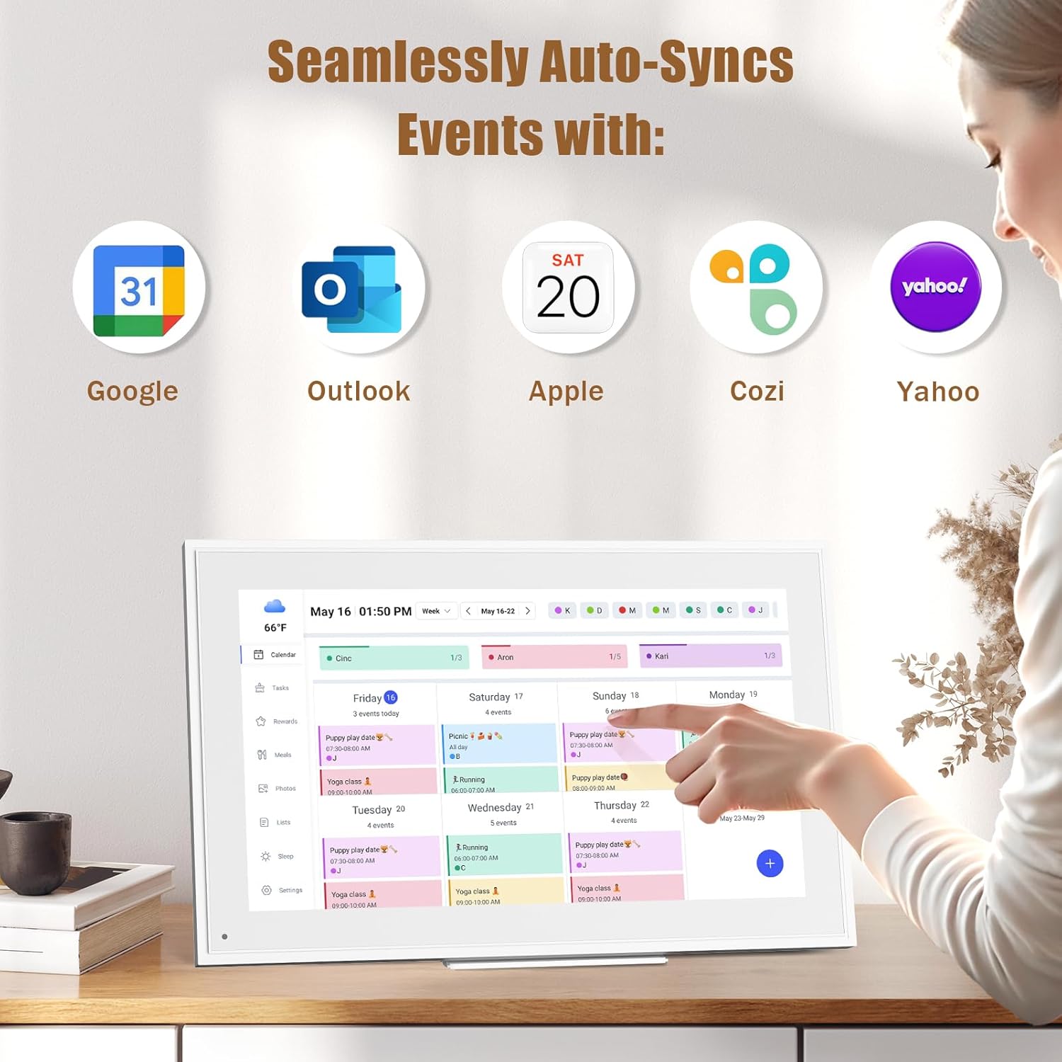 - ✅Easy Set- Up, Seamless Calendar Syncing:Just plug in the device, connect to Wi-Fi and sync your calendars.all your events will automatically populate and sync in minute. Compatible with Google, iCloud, Outlook, Cozi, and Yahoo. Add events directly on the device or through the eCalendar app.