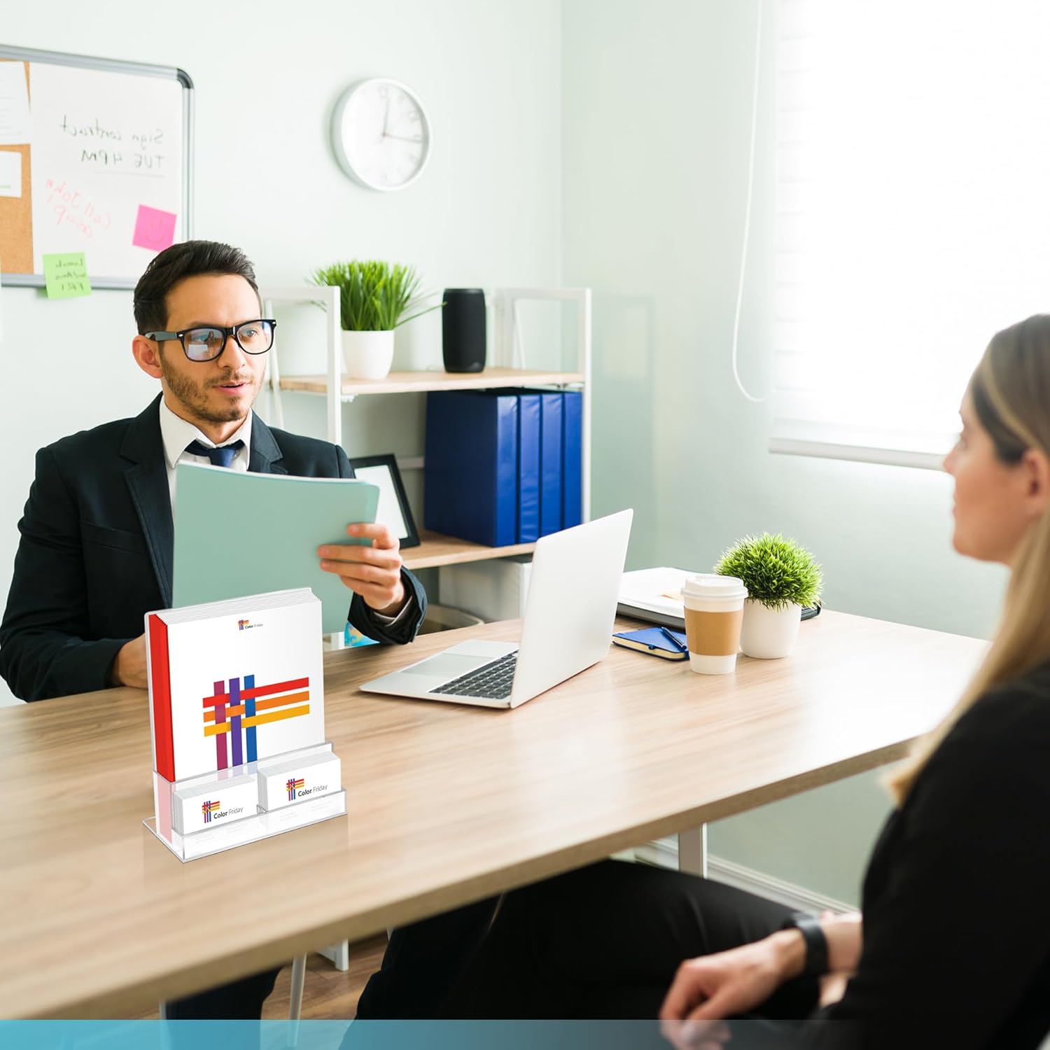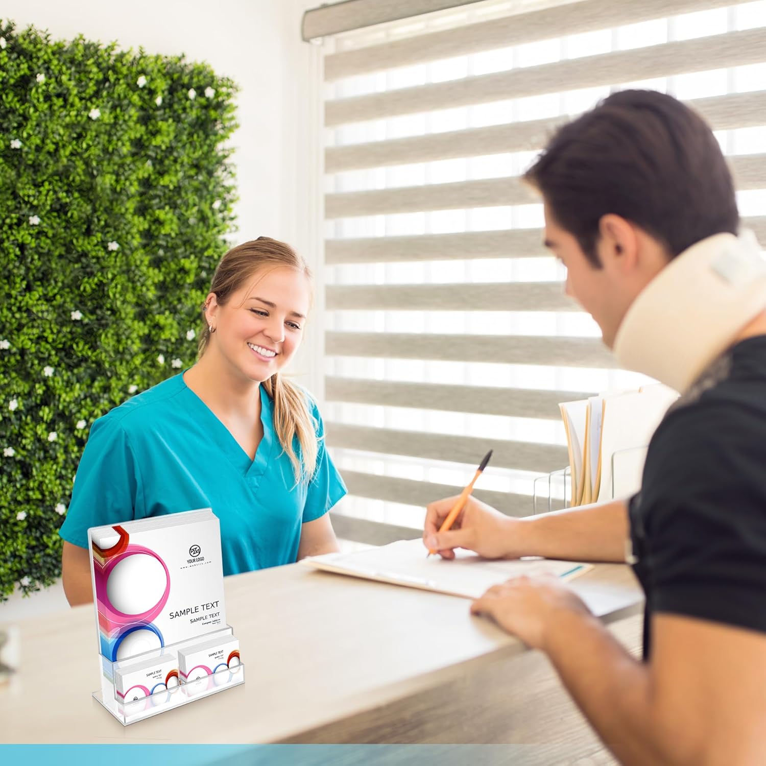 - SPACE SAVING Our Brochure holder with business card pocket combines two holders in one compact unit, perfect for countertops, reception desks, and trade show booths