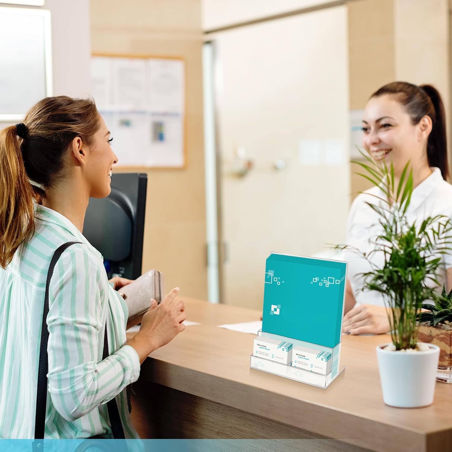 - SPACE SAVING Our Brochure holder with business card pocket combines two holders in one compact unit, perfect for countertops, reception desks, and trade show booths