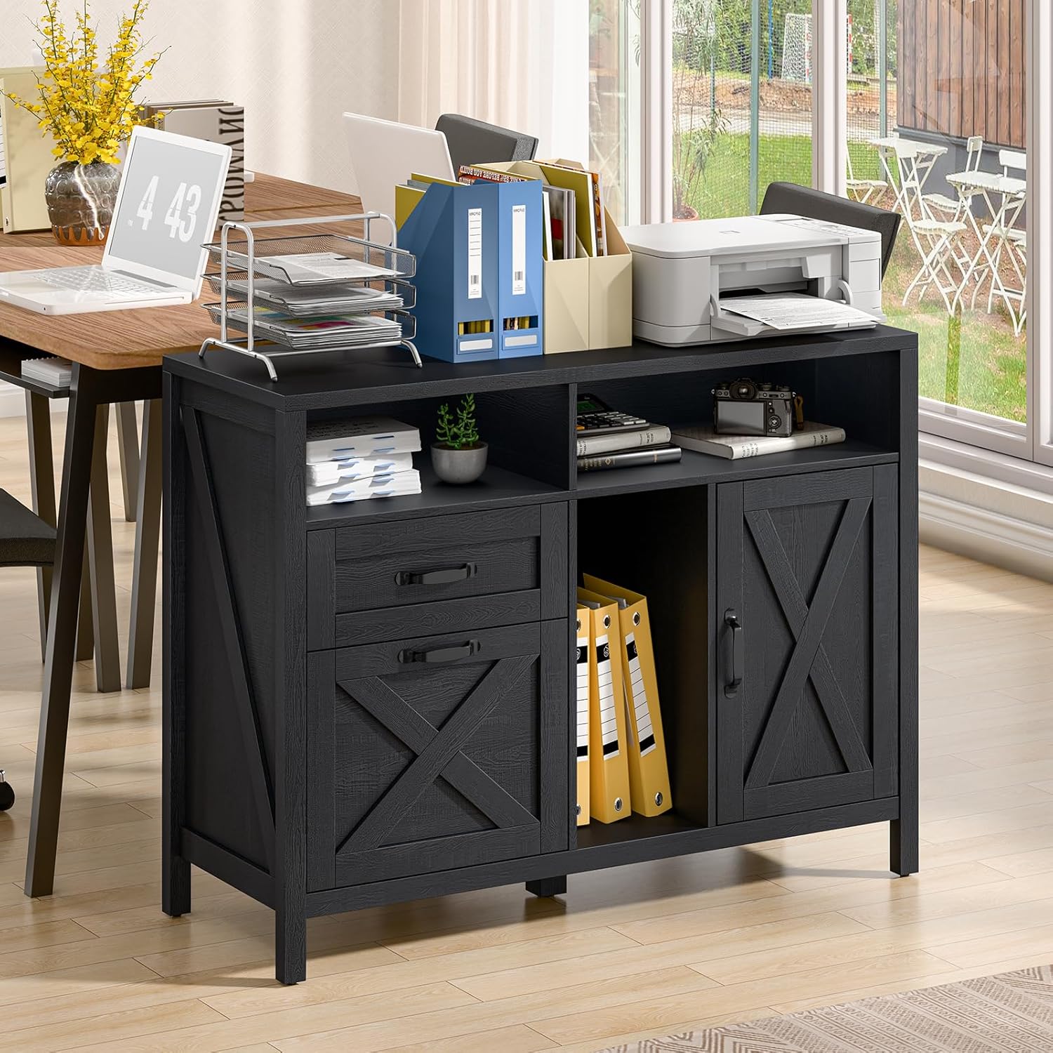 - ăVersatile File CabinetăThe wide filing cabinet with open storage shelves and file drawers for different organizing needs. The spacious desktop is ideal for office equipment such as printers and scanners