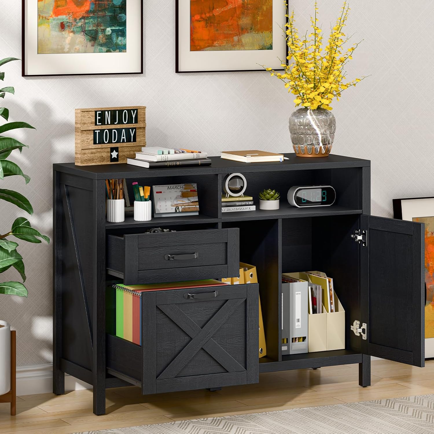 - ăStylish Farmhouse CharmăThe farmhouse file cabinet is uniquely charming. It has a minimalist yet distinctive design that adds a cozy atmosphere to the space. It is ideal for decorating your home