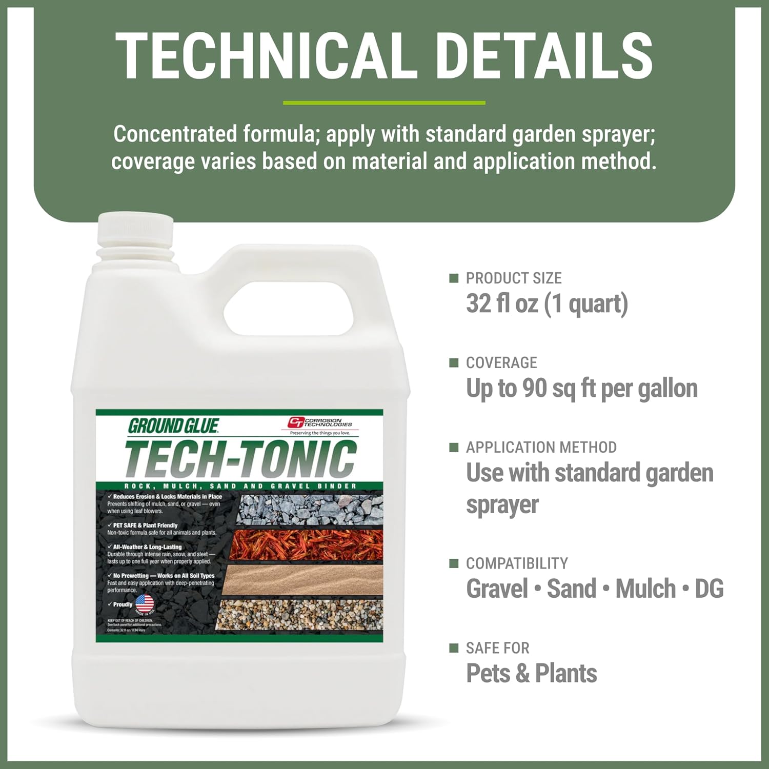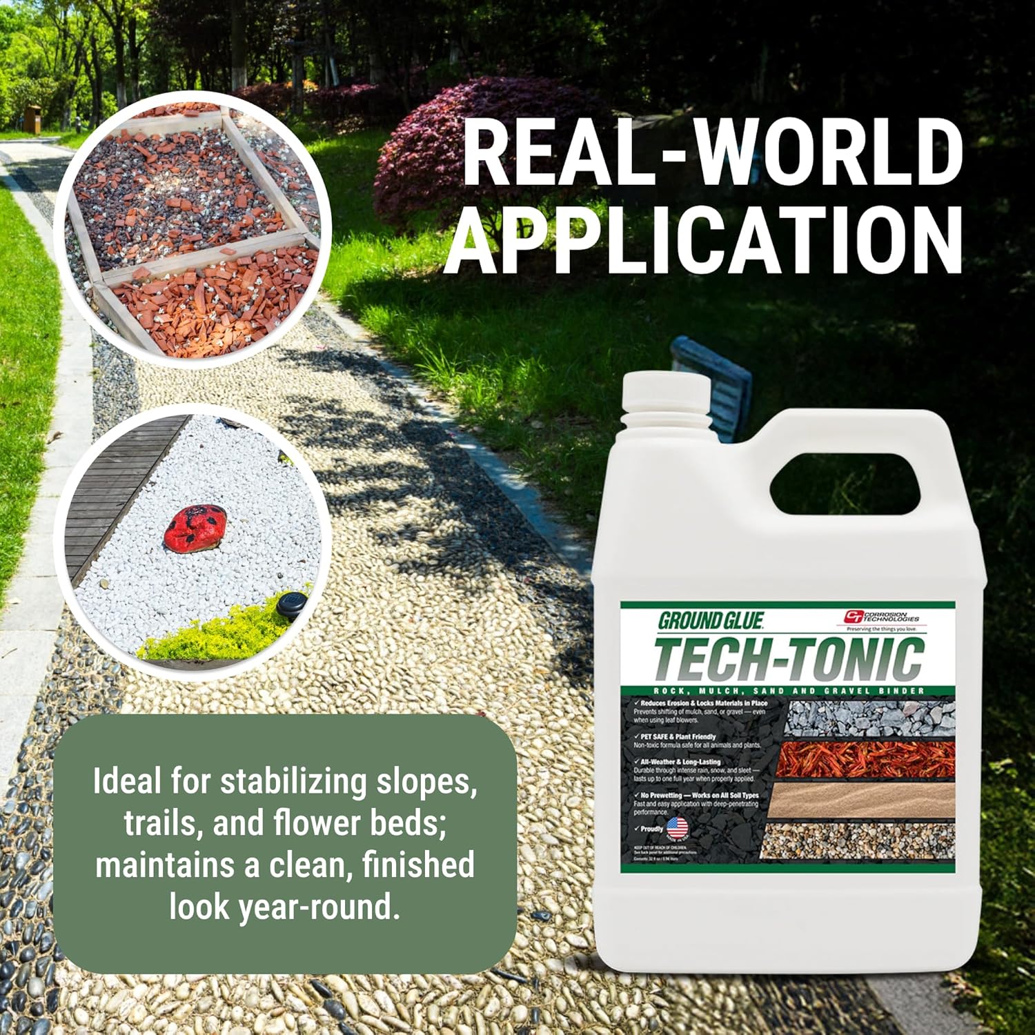 Ground Glue Tech-Tonic Landscape Adhesive for Rock, Mulch, and Sand, Weatherproof Long-Lasting Stabilizer for Trails & Slopes, Pet-Safe Binder for Pea Gravel, Bark & Flower Beds, 32 Fl. Oz.