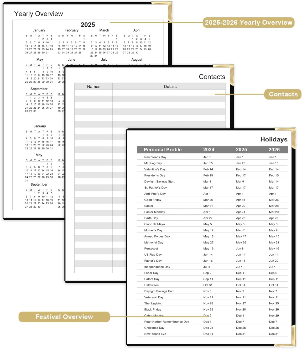 - 224 SHEETS / 448 PAGES - This undated planner measures 8.5 x 11 inches, a comfortable size for daily use and carrying. The planner notebook includes a Yearly Overview, Personal Information, Contacts, Important Dates, Monthly Pages, Daily Pages, Notes Pages, and a festival overview page covering 2025-2027. It comprehensively contains everything needed for daily use.