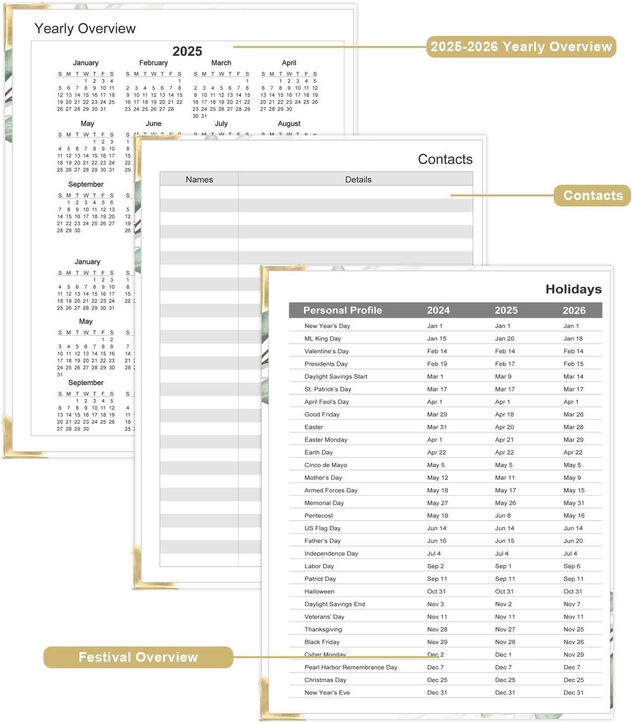 - 224 SHEETS / 448 PAGES - This undated planner measures 8.5 x 11 inches, a comfortable size for daily use and carrying. The planner notebook includes a Yearly Overview, Personal Information, Contacts, Important Dates, Monthly Pages, Daily Pages, Notes Pages, and a festival overview page covering 2025-2027. It comprehensively contains everything needed for daily use.