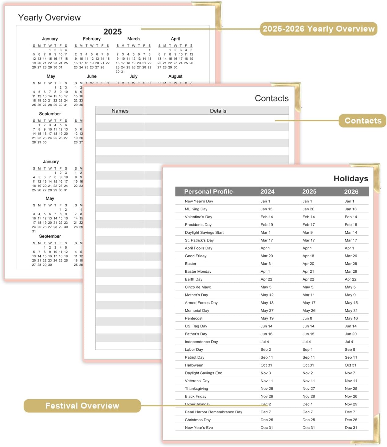 - 224 SHEETS / 448 PAGES - This undated planner measures 8.5 x 11 inches, a comfortable size for daily use and carrying. The planner notebook includes a Yearly Overview, Personal Information, Contacts, Important Dates, Monthly Pages, Daily Pages, Notes Pages, and a festival overview page covering 2025-2027. It comprehensively contains everything needed for daily use.