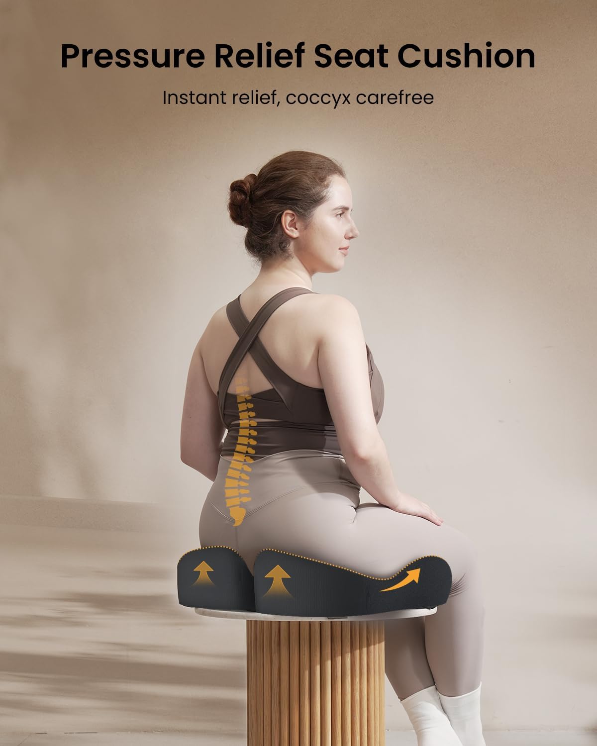 - Targeted Pressure Relief: The split design of our cushion targets pressure points on hips, thighs, and coccyx, alleviating lower back and hip pressure while encouraging proper posture. Experience relief and comfort during extended periods of sitting