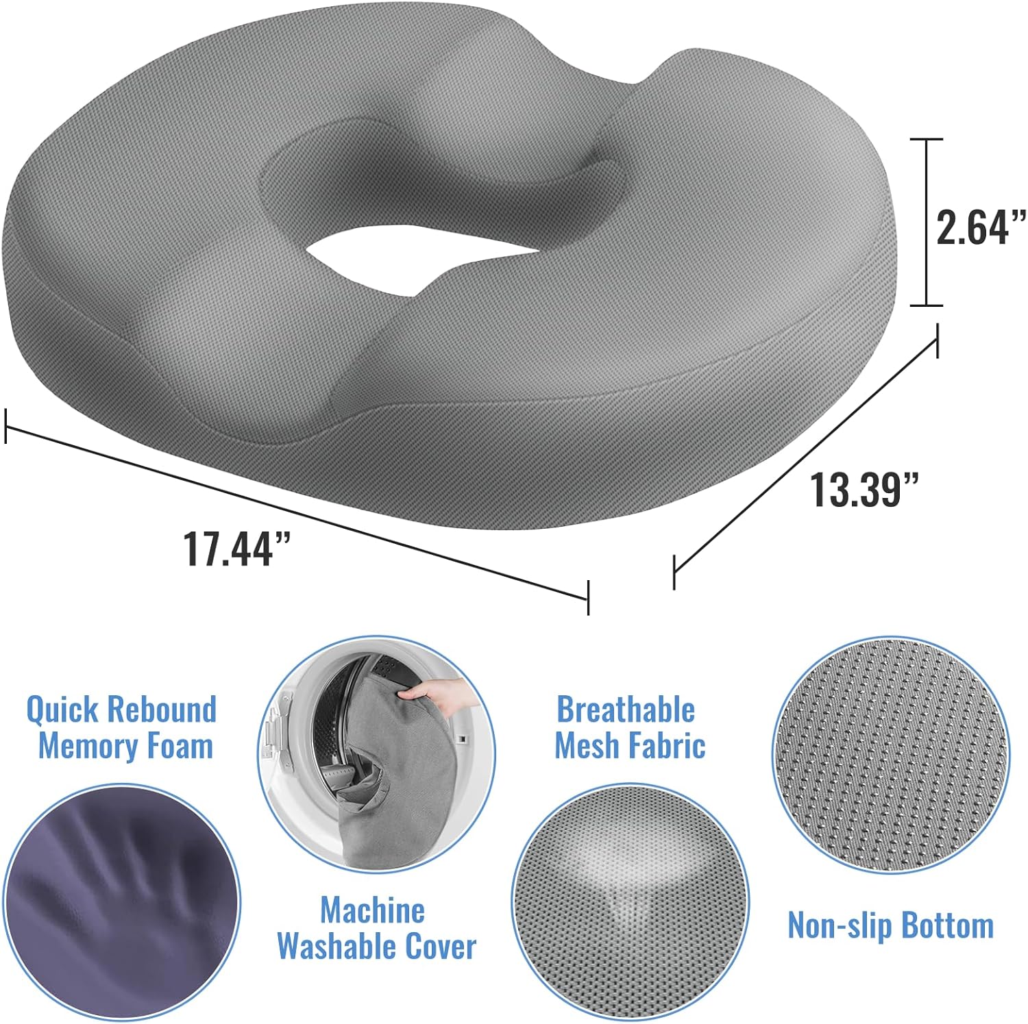 - Suitable Size: CloudBliss donut pillow measures 17.44" x 13.39" x 2.64". The donut pillow can be taken anywhere, and can be used for any type of chair, such as wheelchair, office chair, airplane, car, bleachers at games, dining chair, etc. Its portable and lightweight design allows you to take it with you wherever you go, ensuring you never have to compromise on your comfort