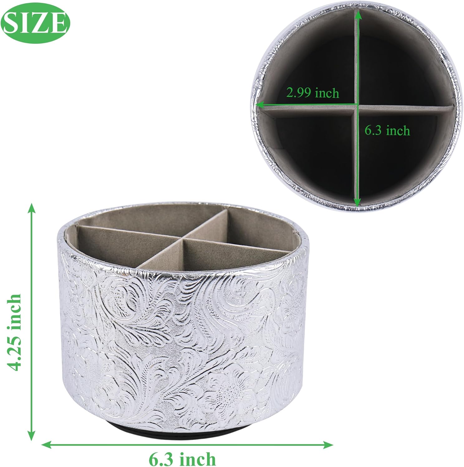 lizimandu Round Leather Art Supply Organizer,Remote Control Holder,360 Degree Spinning,Multi-Functional Pencil Holder,4 Compartments Desktop Stationary Organizer(1-Carved Silver)