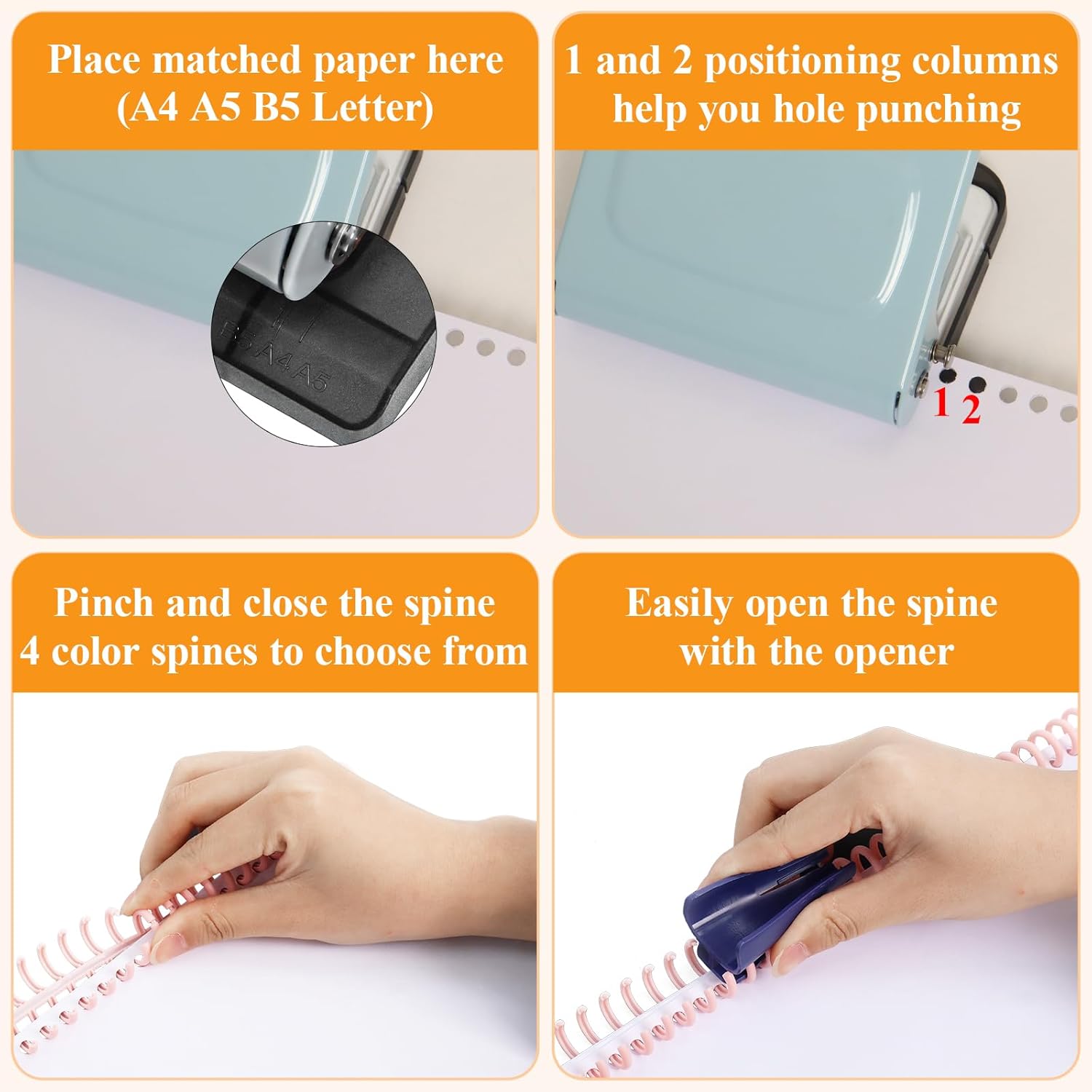 - Trimmable Spiral Binding Coils: Includes 10 spiral binding coils (2 pink, 2 mint green, 2 white, 4 translucent). Coils hold up to 75 sheets and are trimmable to fit various paper sizes