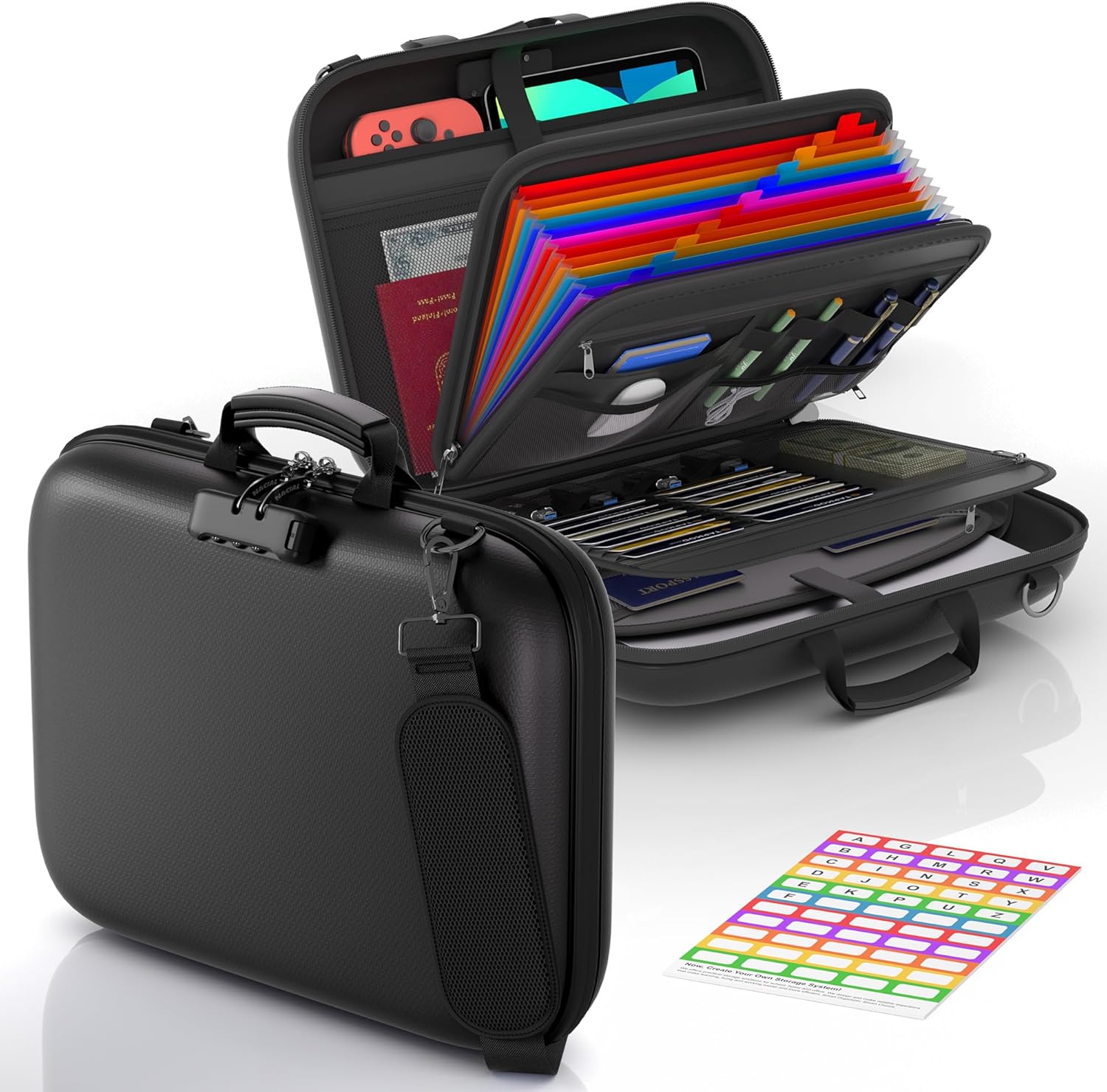 - 【Spacious Multi-Pocket Storage】: With dimensions 15.4 x 11.8 x 3.4 in (full load 14.5 x 10.7 x 4 in), our fireproof box provides generous capacity without sacrificing portability. It features a 13-pocket accordion file folder with labels, compartments for passports, cards, pens, U-disks, and a 15.6" laptop section. Enjoy the confidence of having your essential documents and valuables safely organized, and ready whenever you need them—at home or while traveling.