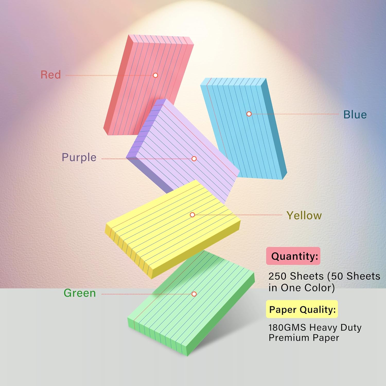 250 Count Colored Index Cards 3x5, 180gsm Heavy Weight Flash Cards, Ruled Index Cards, 5 Color (50 Sheets Each), Portable Note Taking for Students, Teachers, Study Note Cards for Office Home School