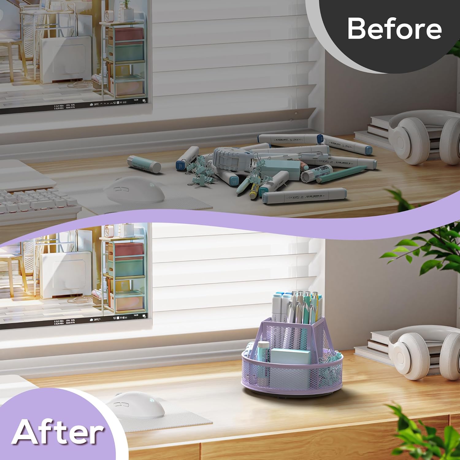 - Efficient Desk Organizer for All Your Needs: The Purple Metal Mesh Desk Organizer is the perfect solution for keeping your office, home, or school workspace tidy. With 5 compartments, it offers ample storage for all your stationery items, making it an essential addition to your desk organizers and accessories collection
